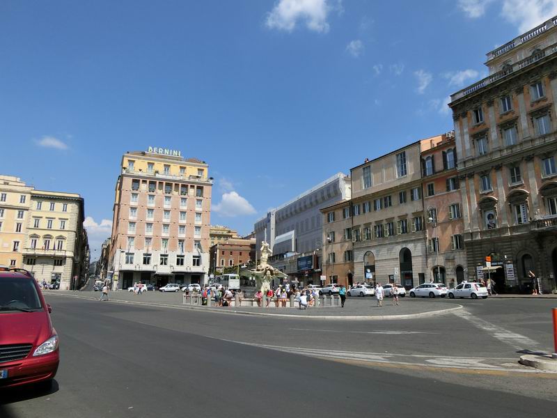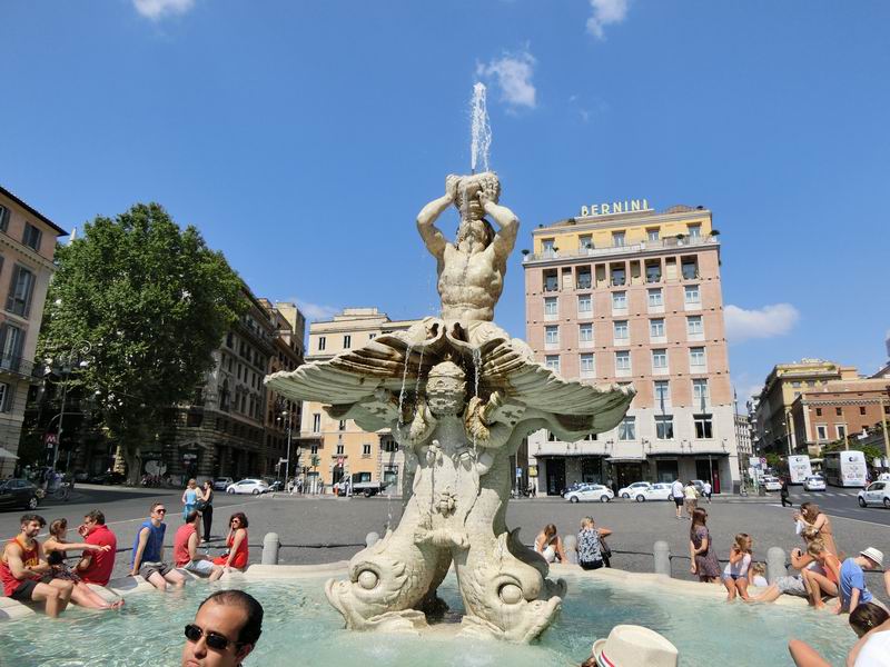 中央にベルニーニによるトリトーネの噴水があります。4頭のイルカの上の貝に海神トリトーネが乗り、ホラ貝を吹く姿を表現。一番上のホラ貝の部分から水が吹き上がっています。広場を囲む道路は交通量が多いです。信号もないので気をつけて中央へ渡ってください。また、広場の北側、ベネト通りの入口には同じくベルニーニ制作の蜂の噴水があります。こちらはトリトーネの噴水に比べ小さいですが、ぜひ一緒に見るのがおすすめです。どちらの噴水も地下鉄バルベリーニ駅を出てすぐです。