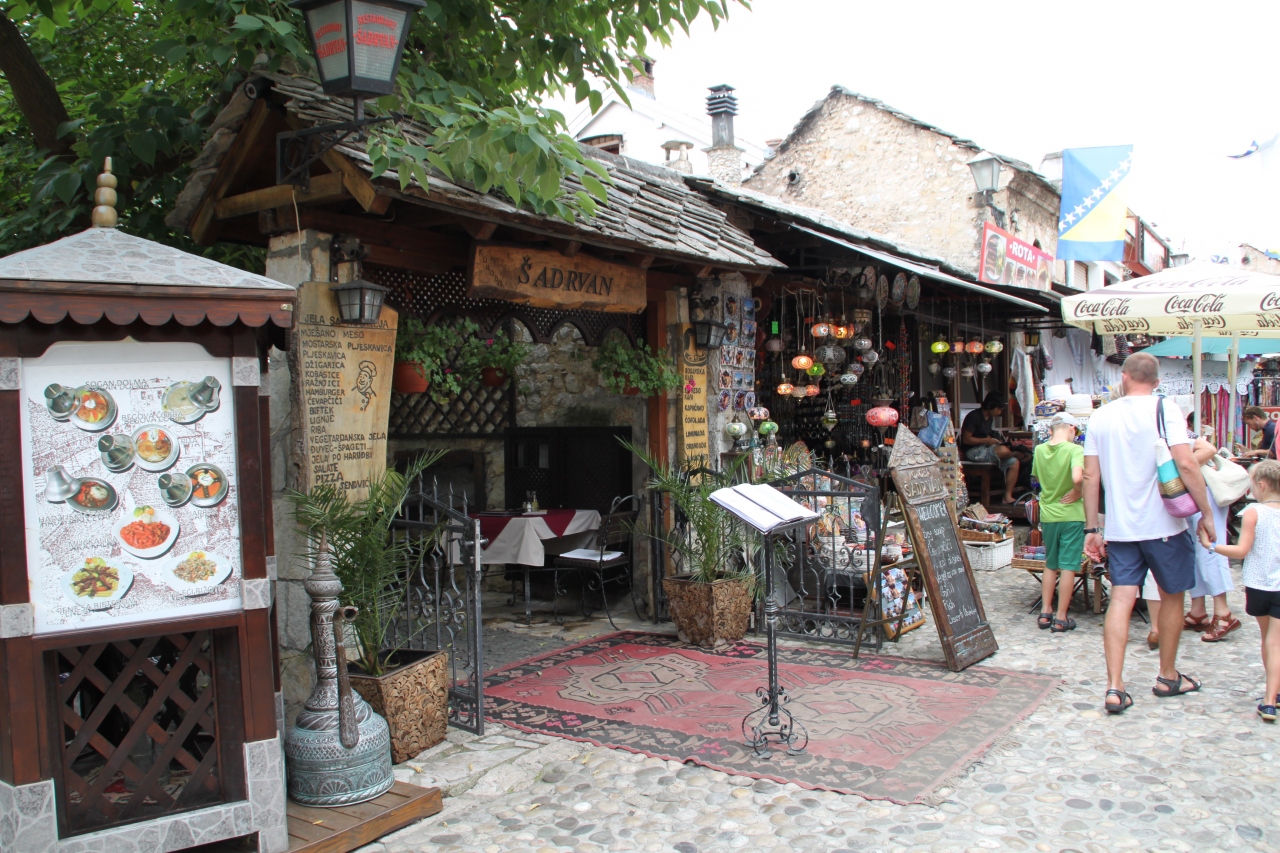 「地元の料理はあるか?」と聞いたところ、Mostarian sahanという一人用のプレートメニューを勧められました。地元の料理が5種類くらい入っていて、少しずついろいろ試してみたい一人旅の女性にはぴったりだと思います。私は小食なほうですが、ちょうどいいランチになりました。ユーロも問題なく使え、4ユーロでした。ビールも地元のビールを出してくれます。
