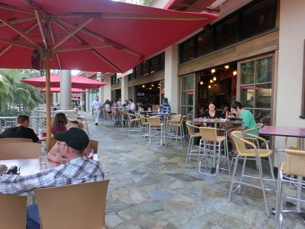 テラス席を希望し、まあ、通り道にもなるのですがワイキキビーチウォークを見下ろす席に座りました。