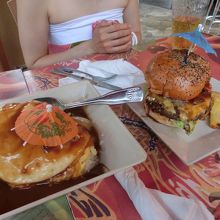 ハンバーガーはいろいろ具があって大きいので1/3にして食べました。ロコモコは見かけ天津丼でした。