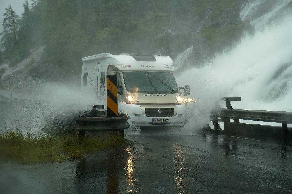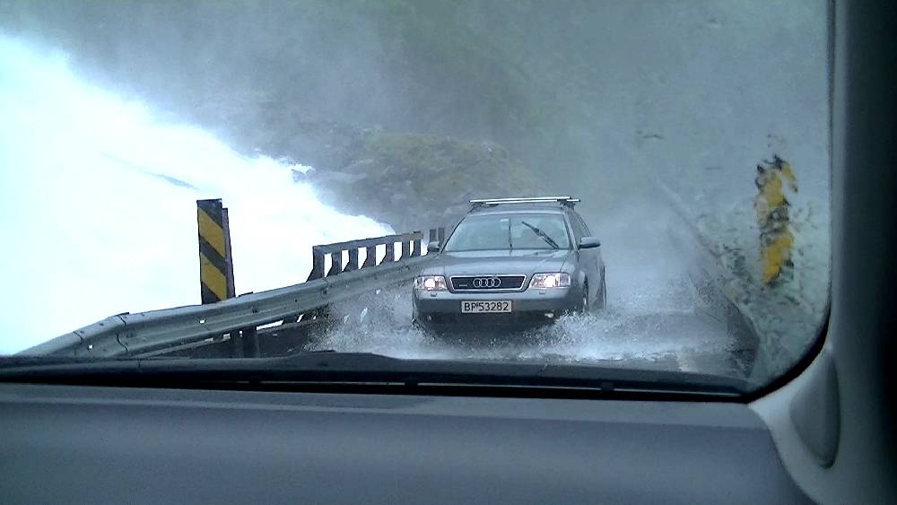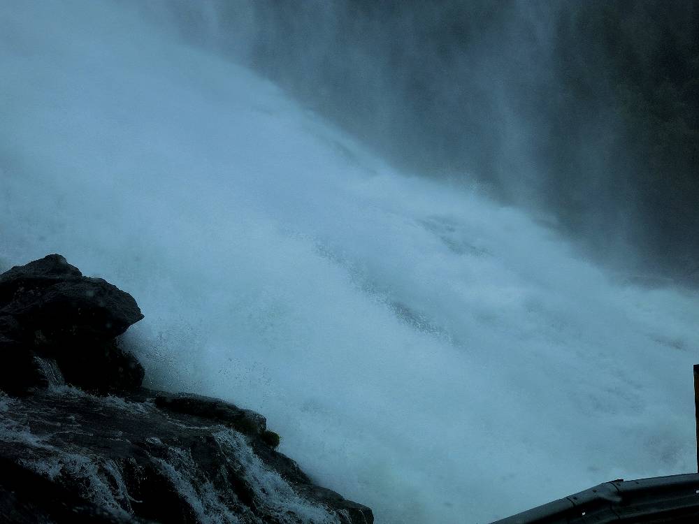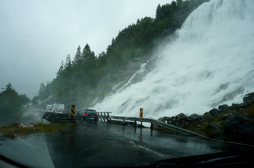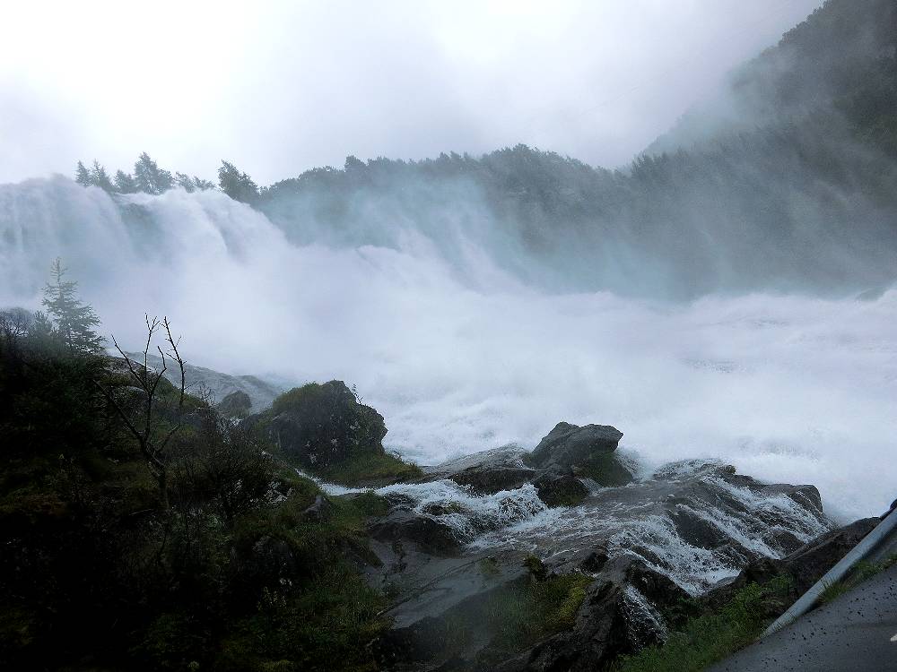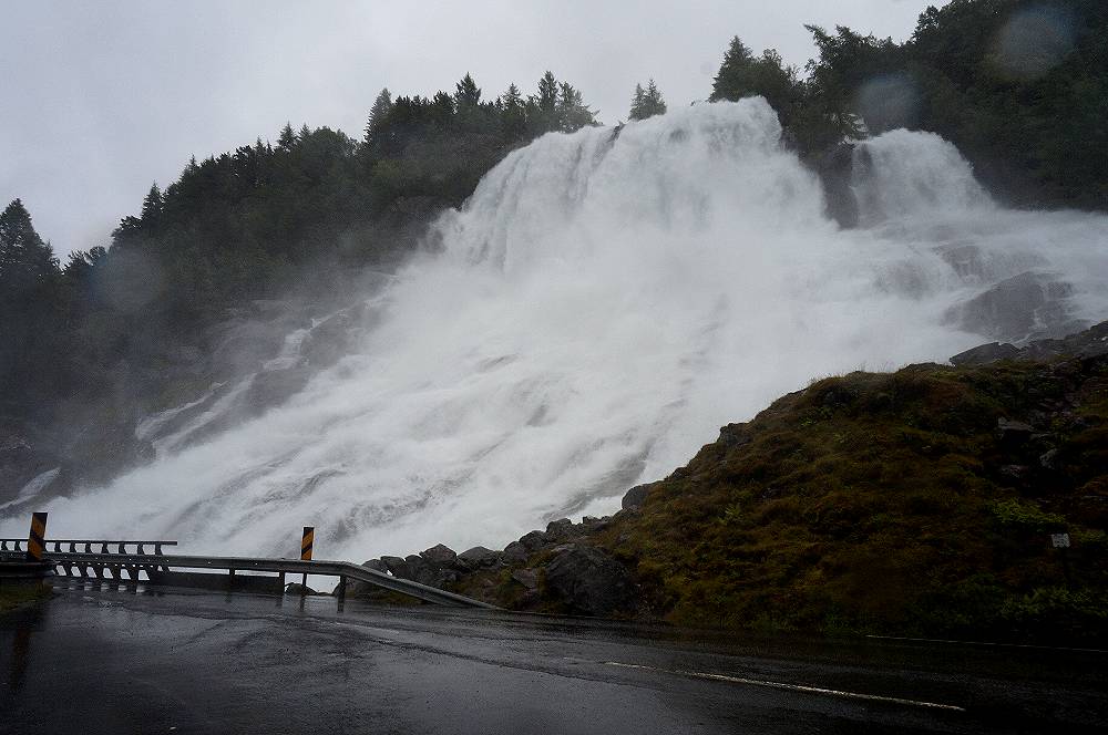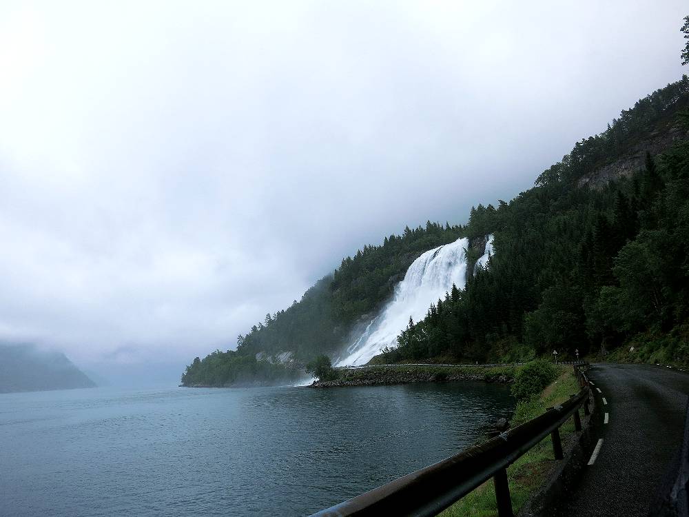 Oddaからハルダンゲルフィヨルド方面にぬける長いトンネルを通り、Arsnesのフェリー乗り場のすぐ手前にある大きな滝。道路際すれすれに滝が流れ落ちていて、雨の後だっただけに、水量が多く、通行に危険を感じるほどだった。水しぶきの少ないタイミングを見計らって通り抜けたが、大雨の時は通行を避けた方が無難だ。