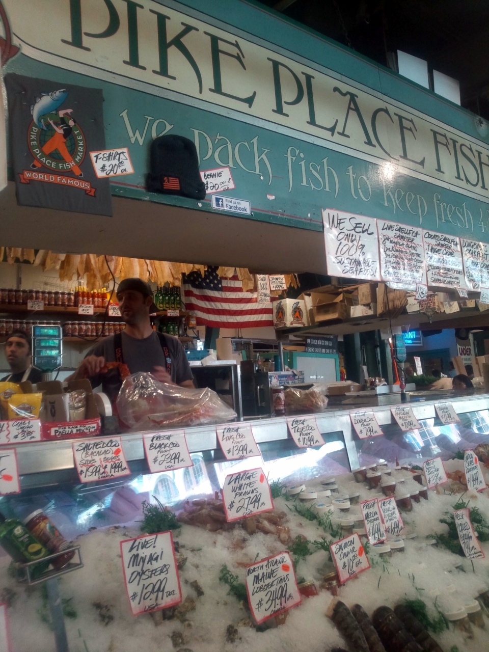 シアトルにきたらぜひ立ち寄ってもらいたいマーケットです。果物やナッツなどなどの食べ物やお花やお土産品、果てはエスニックマーケットまで。キョロキョロしているだけでも楽しいです。観光客が集まるのは魚売り場。なんでも注文を店員さんが投げて渡すのが恒例ということで。。。