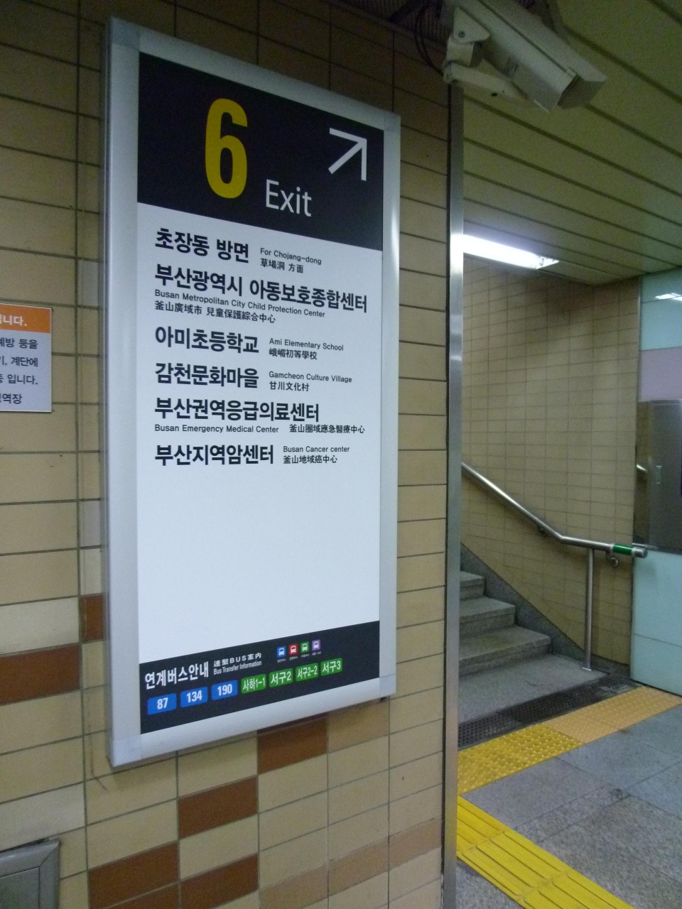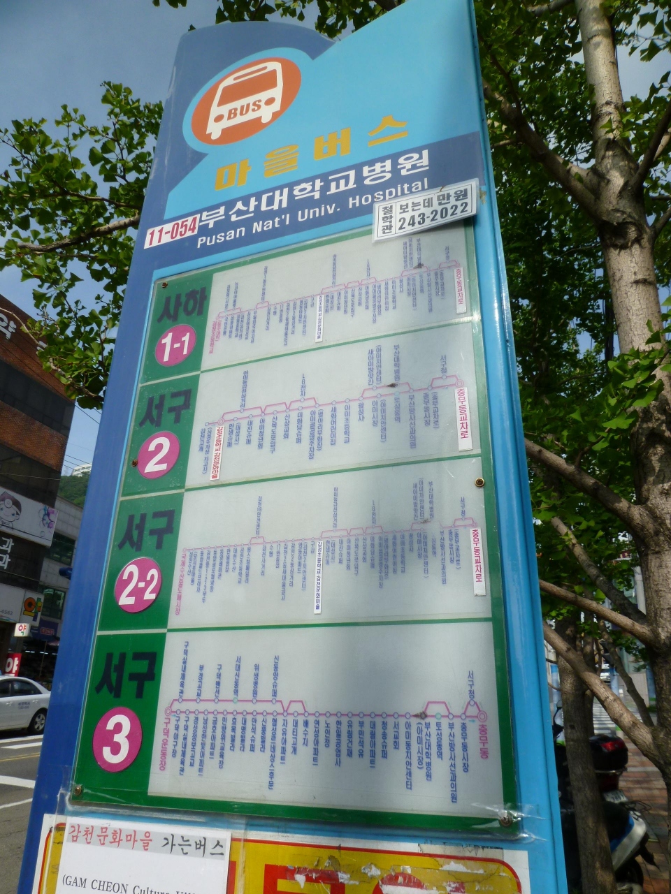 改札を出て、6番出口から地上に上がり、最初の道を右にまがってすぐにある「プサンデハッビョンウォン」停留所からマウルバス1-1番、2番、2−2番に乗車し、7つの停留所を過ぎた「カムチョンムナマウル」停留所で下車で到着です。