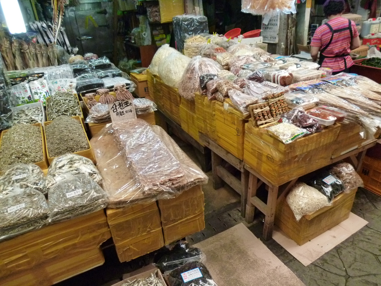 食品全般に扱われている市場で、肉や魚、野菜はもちろん、朝鮮人参などの漢方系の野菜(?)が路上に並んでいたり、チヂミを焼いているおばさんがいたり、活気にあふれています。