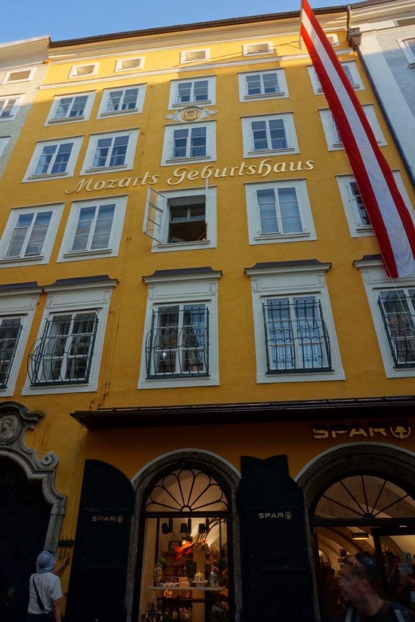 ザルツブルクの中心街はとても小さいので、地図通りに行けばすぐに見つかると思います。一見普通のアパートですが、鮮やかな黄色いアパートの前で観光客がカメラを構えて写真を撮っていたので、ここかとわかりました。1階がスーパーだったことにちょっとした驚き。でもここのスーパーだけはちょっとオシャレでした。