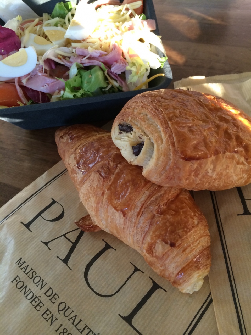 シャルルドゴール国際空港内にあるこのお店ではクロワッサンやパンオショコラ、サラダなどが販売されています。AF(エールフランス)便のチェックインカウンター前にあり、テイクアウトもテーブルでの食事もできます。サラダは山盛りですが、ドレッシングが足らず味が物足りませんでした。