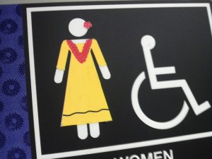 ホノルル空港のトイレのサイン、ちゃんと女性はムームーを着てレイをかけてるんですよね~。