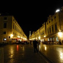 ドブログニク旧市街のメインストリートです。道幅はかなり広くて、両サイドにはレストランや土産もの屋さんなど、いろいろなお店があります。また、脇道もいっぱいあって、そちらにもいろいろお店があります。夜になっても、人通りが多く、安心して歩けます。