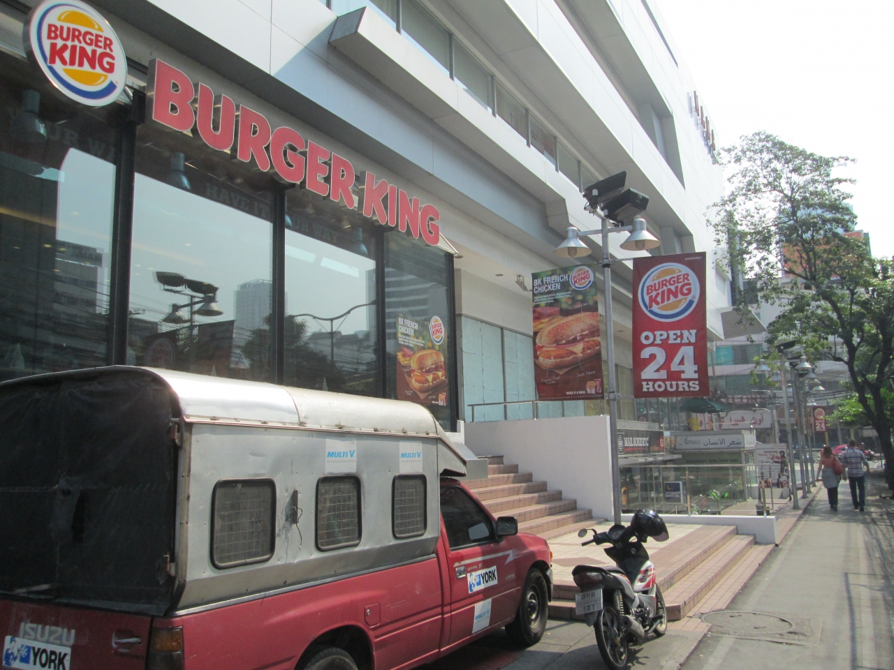 スクインピット通りのソイ3の入口、ナナの交差点のナナスクウェアにある。24時間営業で小腹が空いたときにも利用できる。スワンナプーム空港にもバーガーキングはあるが値段が空港価格なので、ここでテイクアウトして食べることもある。