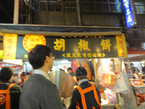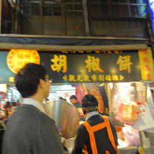 饒河街夜市(松山慈祐宮の近く)の大きな門の下にある屋台の胡椒餅店です。黒いTシャツが目印、人気店で8時過ぎは長蛇の列でした。覚悟して並ばないと、熱々パリパリでジューシーな胡椒餅は食べられません。夜市自体も混雑してるので出来るだけ早い時間に行くことお薦めです。士林夜市にも同じに屋台がありますがこちらも同様です。一度食べると嵌る味です。