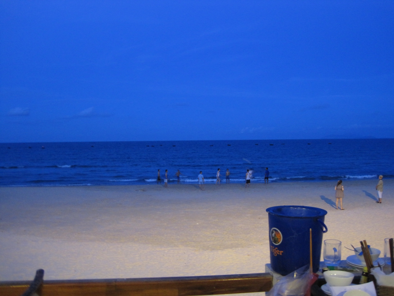 - 夕闇に映える白い砂浜。目の前では現地の人も泳いでいません。テラス席が良いです。