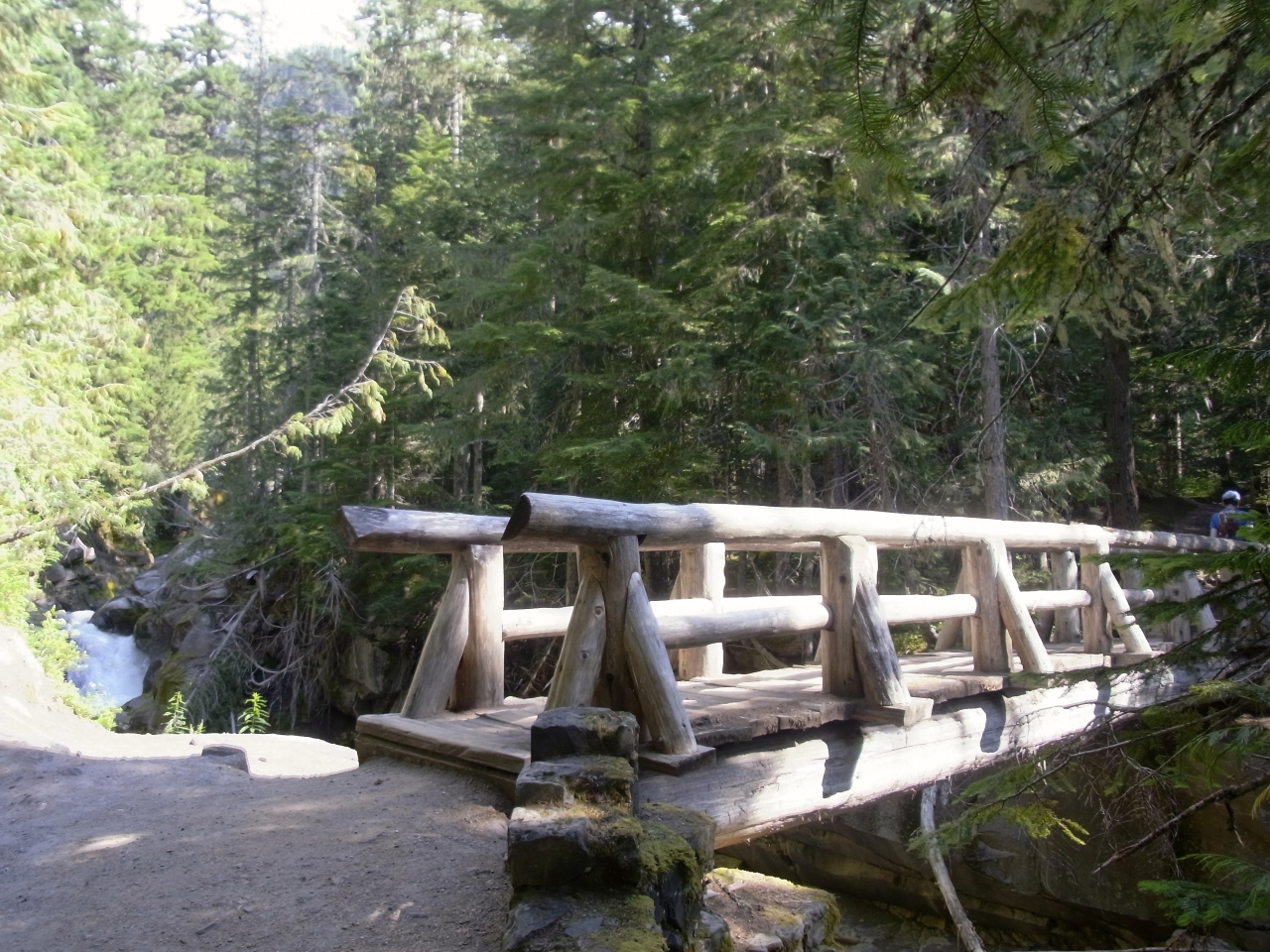 ここからは見えませんが、続くトレイルを1.6km程行き、コメットフォールズの上に出ると、レーニア山が姿を現します。