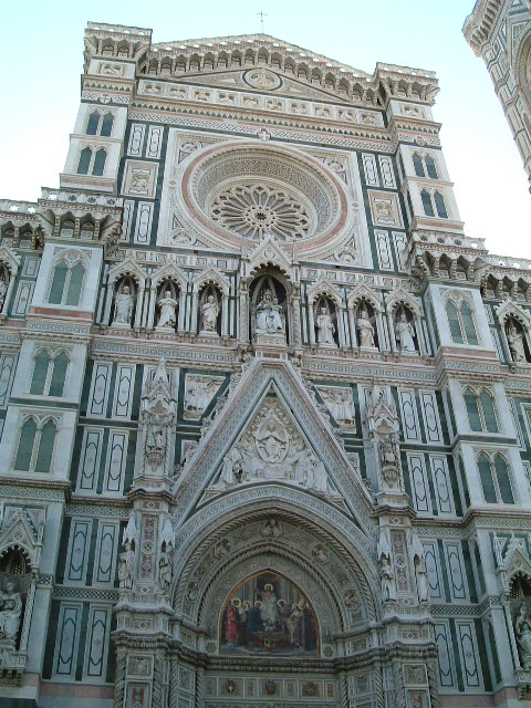 団体旅行で観光しました。まずはその外観の美しさに見とれてしまいます。洗礼堂・鐘楼と並んで建っています。正式にはサンタマリアデルフィオーレ大聖堂です。内部の装飾も素晴らしくフレスコ画、ステンドグラス、彫像などどれも見とれてしまいます。クーポラ頂上までは有料で登れるがかなりの暑さと人の多さで断念しました。