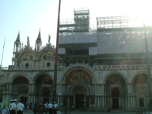 ベネツィアに到着するとまず船着き場から徒歩でサンマルコ広場に来ました。その正面にサンマルコ寺院がドゥカーレ宮殿に隣接しどーんと鎮座ましましています。一部修復中で足場がくまれていたのが残念でしたが内部の天井や壁面を埋め尽くす装飾にはひたすら見とれるばかりでした。ベネチアの栄華ぶりがわかると思えたこの大聖堂です。