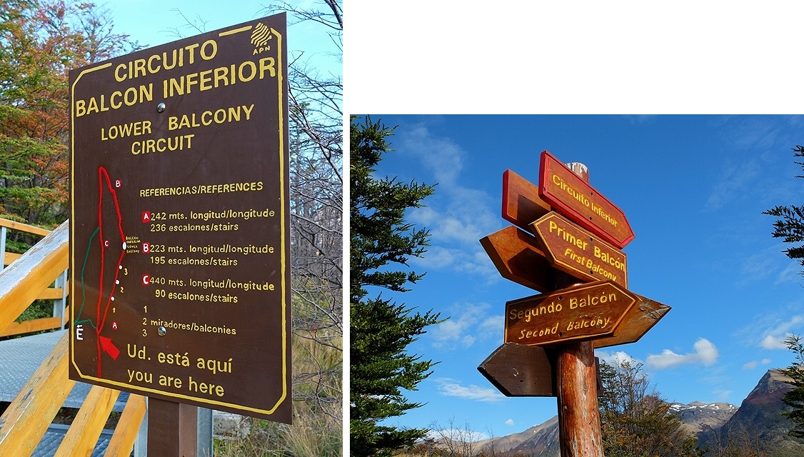 遊歩道のあちこちには、注意事項や絵地図、距離数などを書いた標識が多数あります。