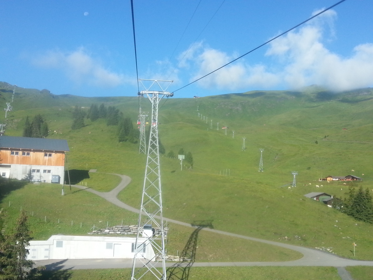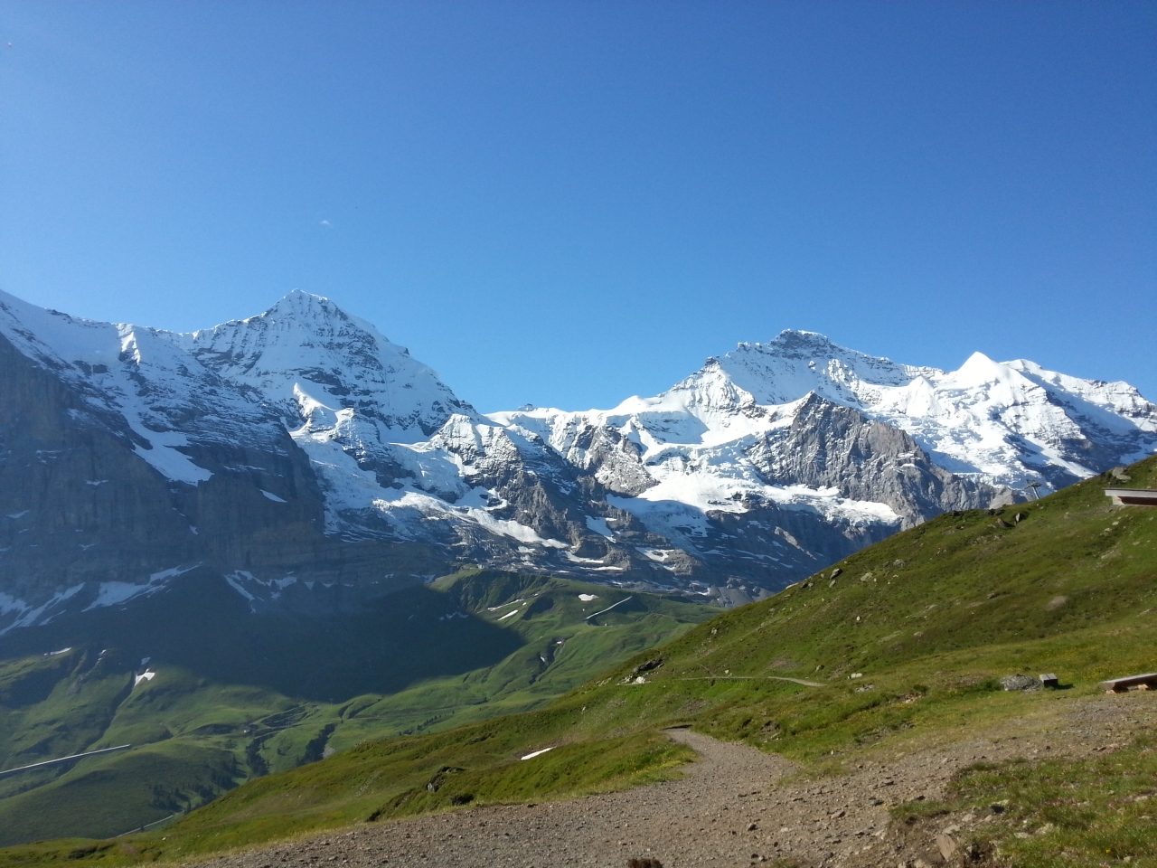 グリンデルワルトからクライネシャイディク行きの列車に乗り、8分でグルント駅に到着。そこからゴンドラに乗りかえ、メンリッヒェンへ。道幅が広くなだらかな下りのハイキングコース。アイガー、メンヒ、ユングフラウが迫ってくるような素晴らしい気色が続きます。1時間ほどで、クライネシャイディクに到着。