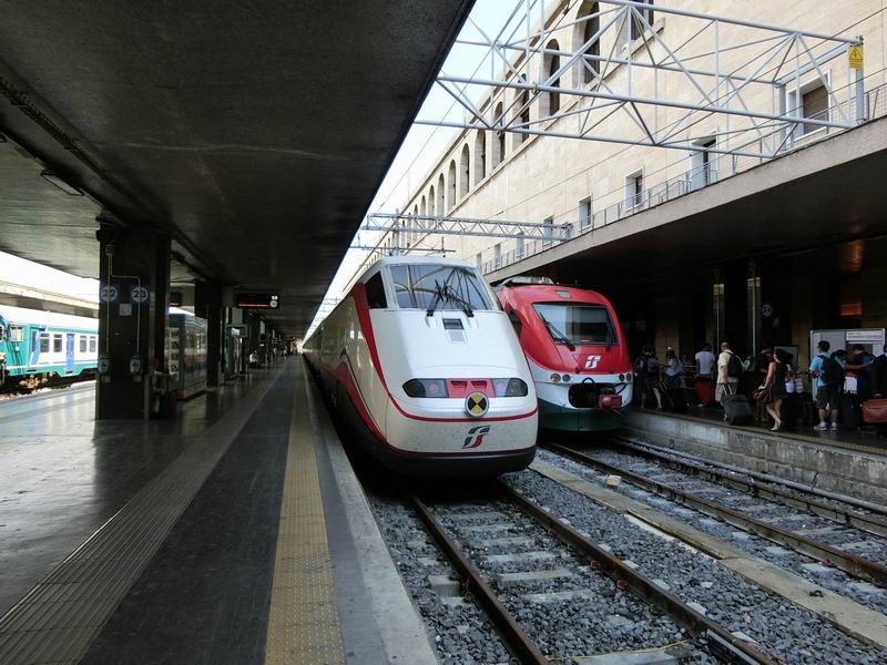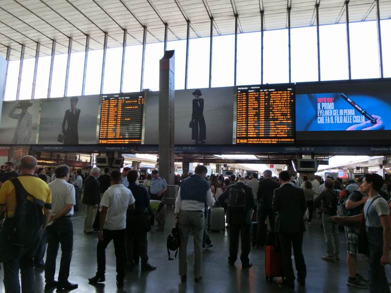 トレニタリア(旧国鉄)、地下鉄、トラム、バス、タクシーと交通機関が集結しているターミナル。トレニタリアの駅は改札口がなくチケットを買って列車に乗るだけです。チケットは窓口でも買えますが、自動券売機(言語は英語を選択)で買うほうが楽に買えると思います。くし形にホームが並び、ホームに向かって左から1番線、2番線…となっているのですが、1番線のずっと奥にローカル路線が発着する1Est、2Estというホームがあり、ここへは到達するのに歩いて10分近くかかるので注意してください。いずれにしても大きい駅なので時間に余裕をもって行き、まずは電光掲示板で列車番号、行き先、発車番線等を確認すると良いと思います。
