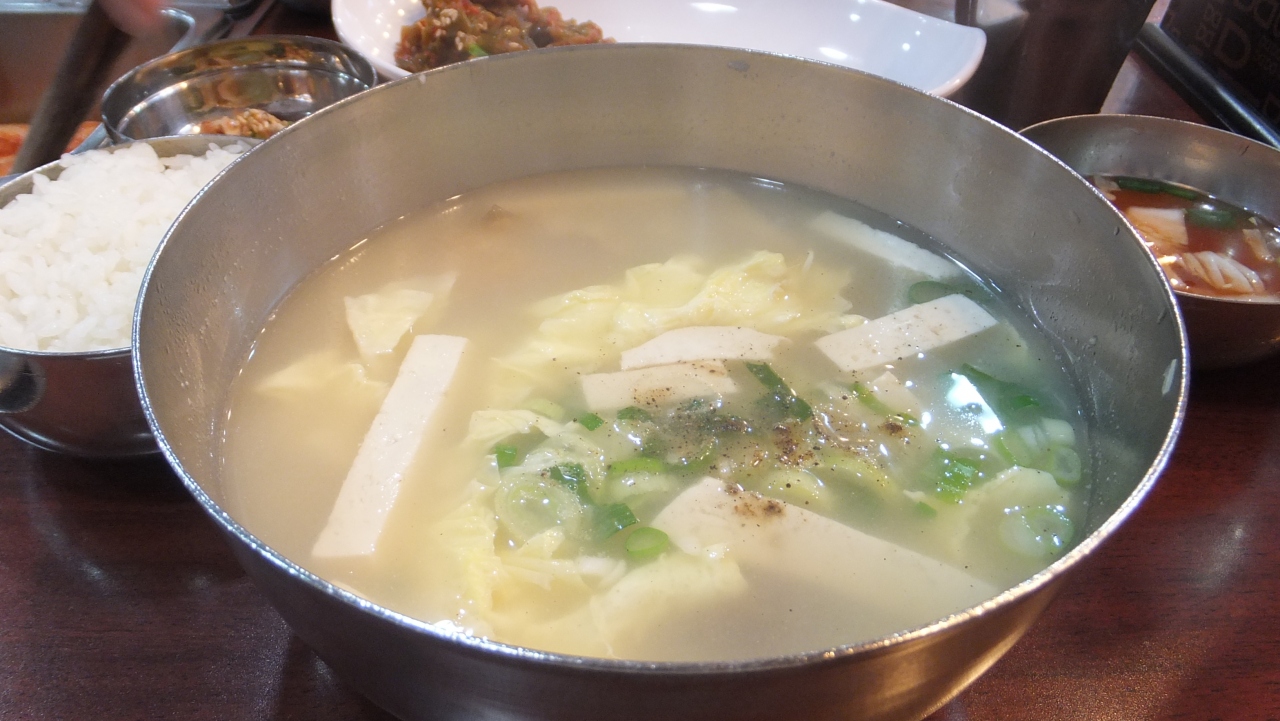 人気店らしく従業員無駄な動きは無く、席に付くや直ぐにキムチ類やメインの干しタラスープがテーブルに並びます。