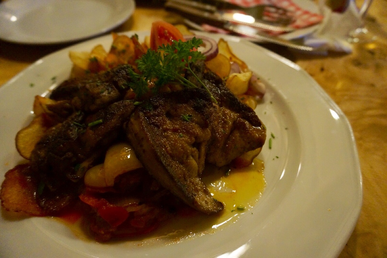 ガイドブックには載ってないが、口コミが非常に良かったので行きました。初日の夜(平日)に飛び込みで行きましたが、撃沈。その場で次回行ける日を予約しました。当日、やっぱり予約してない人は追い返されてました。フォアグラ目的であればメニュー表は英語表記もあるのですがフォアグラのハンガリー語をメモなりして覚えておくと、探すのがスムーズです。ボリューミーで味もしっかりしていて美味しかったです。付け合わせで頼んだグヤーシュスープとガーリックスープが非常に美味しく感動しました。なので次の日の昼、オープンと同時に(12時)行ってまた食べてしまった程。ランチメニューとか無いようなので、予約が微妙な方は、お昼(オープン時)に行けば入れますよ。