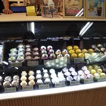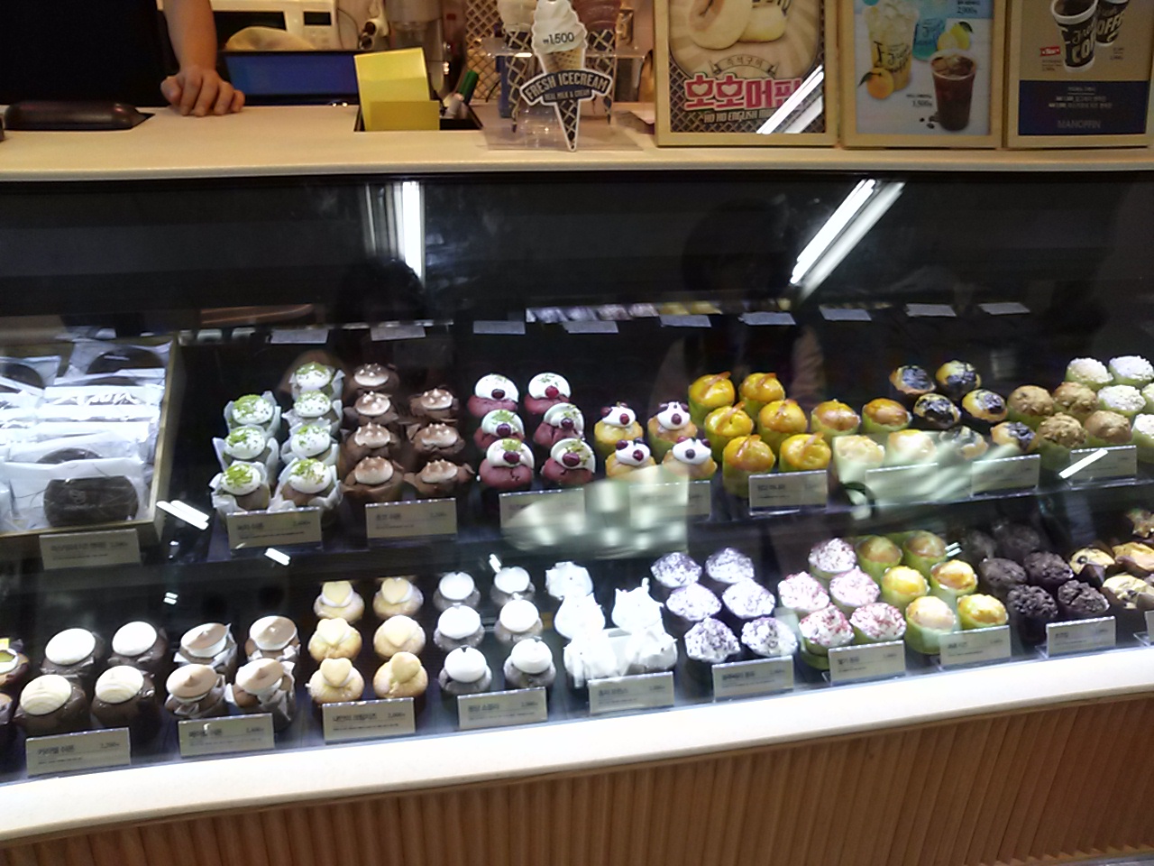 構内にかわいいカップケーキやマフィンがたくさん並んだ