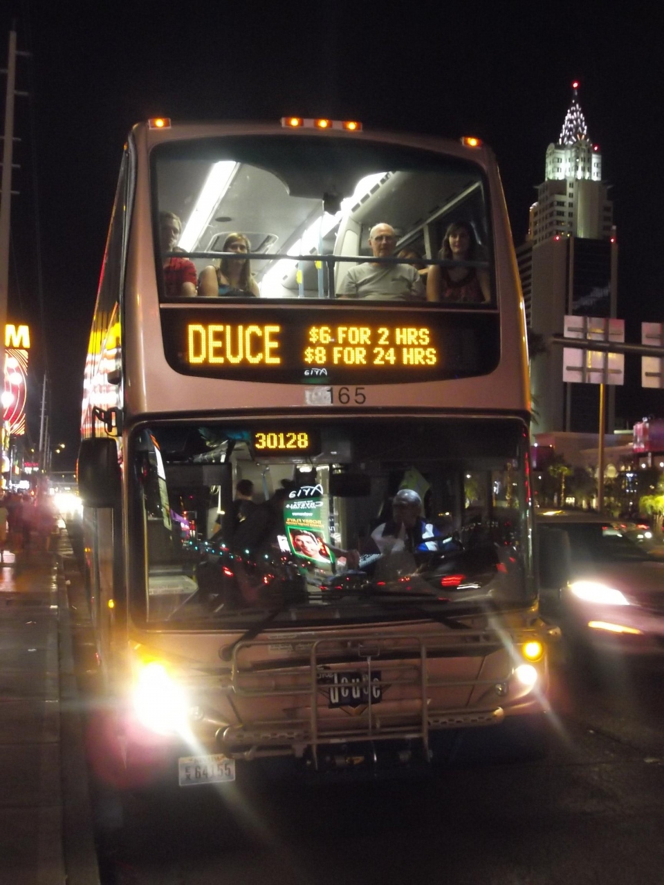 ストリップ通りを移動するのに便利なバスがあります。各駅停車なのは、DEUCEです。2階建てバスで、前扉から乗車し、運転席前でチケットを自分でスライドさせて入ります。