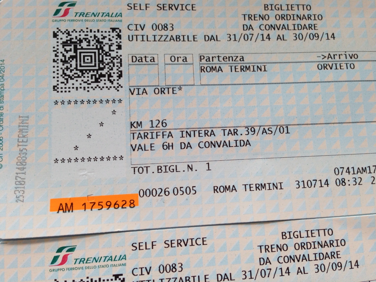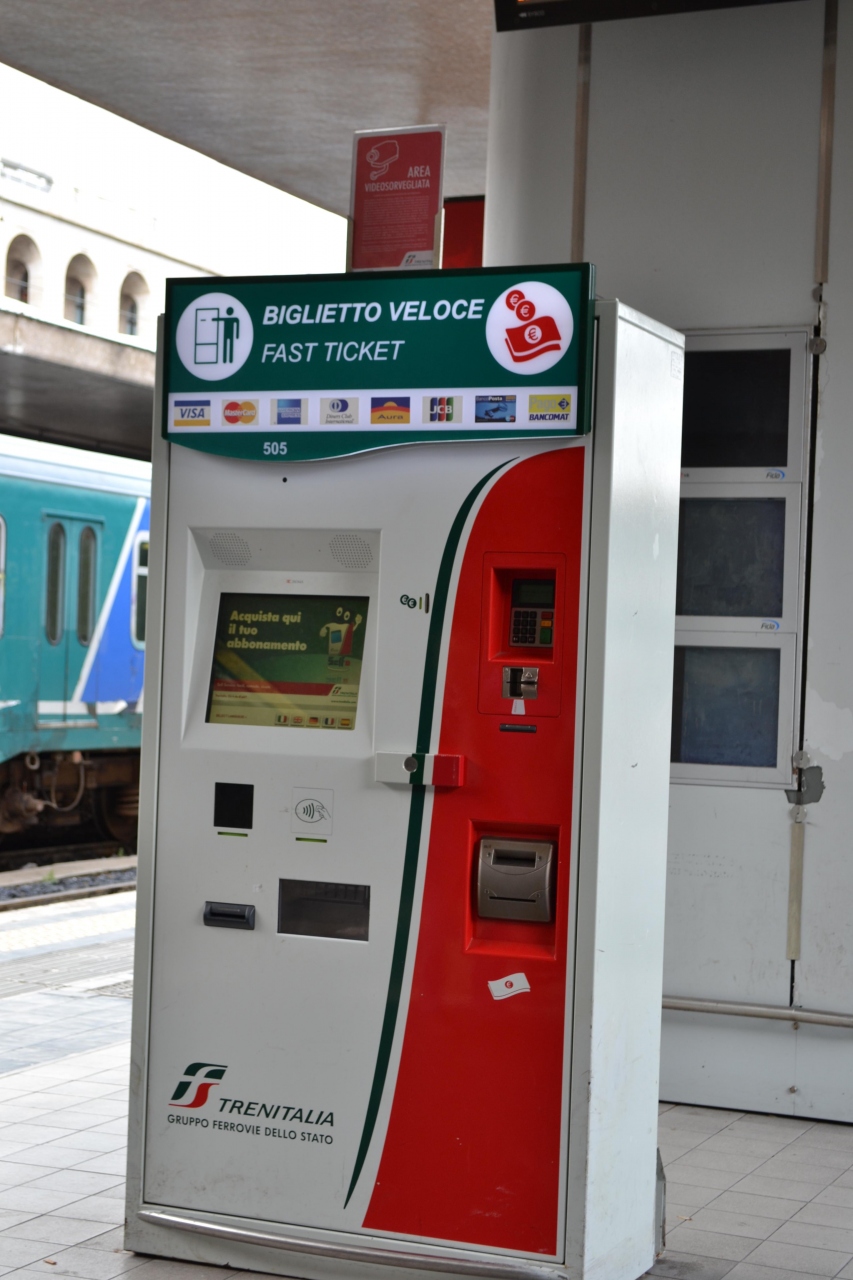 切符はテルミニ駅の自動券売機でクレジットカードにて購入しました。料金は7.9ユーロで帰りの切符も一緒に買いましたが往復割引は無いようです。JCBカードも利用できるようです。乗車前に自動刻機に通して時間と駅名が印字されているか確認しましょう(写真の例では、31071408 TERMINI と印字されています)。ローカル線ホーム内ではお兄さんたちが「バリデーション、バリデーション」と刻印したかを注意してくれますが、相手にしてはいけません。荷物が無くとも親切に車内まで案内してくれてチップを要求されます。荷物があってもなくても、刻印は事前にしておきましょう。電車内では途中駅のアナウンスは無いので、切符購入時に券売機に表示される到着時刻を覚えておきましょう。また、駅のホーム端には駅名が表示されているので確認ができまが、電車が停車時に駅を見ても駅名看板が見つかりにくかったです。