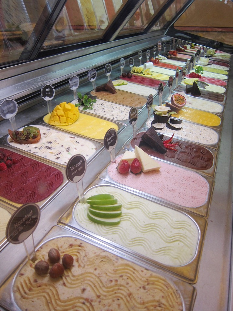 入店したのが正午とアイスクリーム屋さんにしては早めだったおかげか、カウンターのアイスクリームはまだディスプレイがとてもきれいな状態で、思わず目移りしてしまいました。店員さんにオリジナルのメニューもありますよと席に案内されて、見た目が楽しそうなものを頼みました。メニューの写真に負けない美しい盛り付けで、二層になったアイスクリームなど、なかなか手が込んでいる感じで面白いなと思いました。欲を言えば、ホーチミンは今どこでもフリーWi-fiが当たり前の中、このお店のネットはとても遅くて、残念ながらここのアイス画像を友人に送ることはできませんでした。