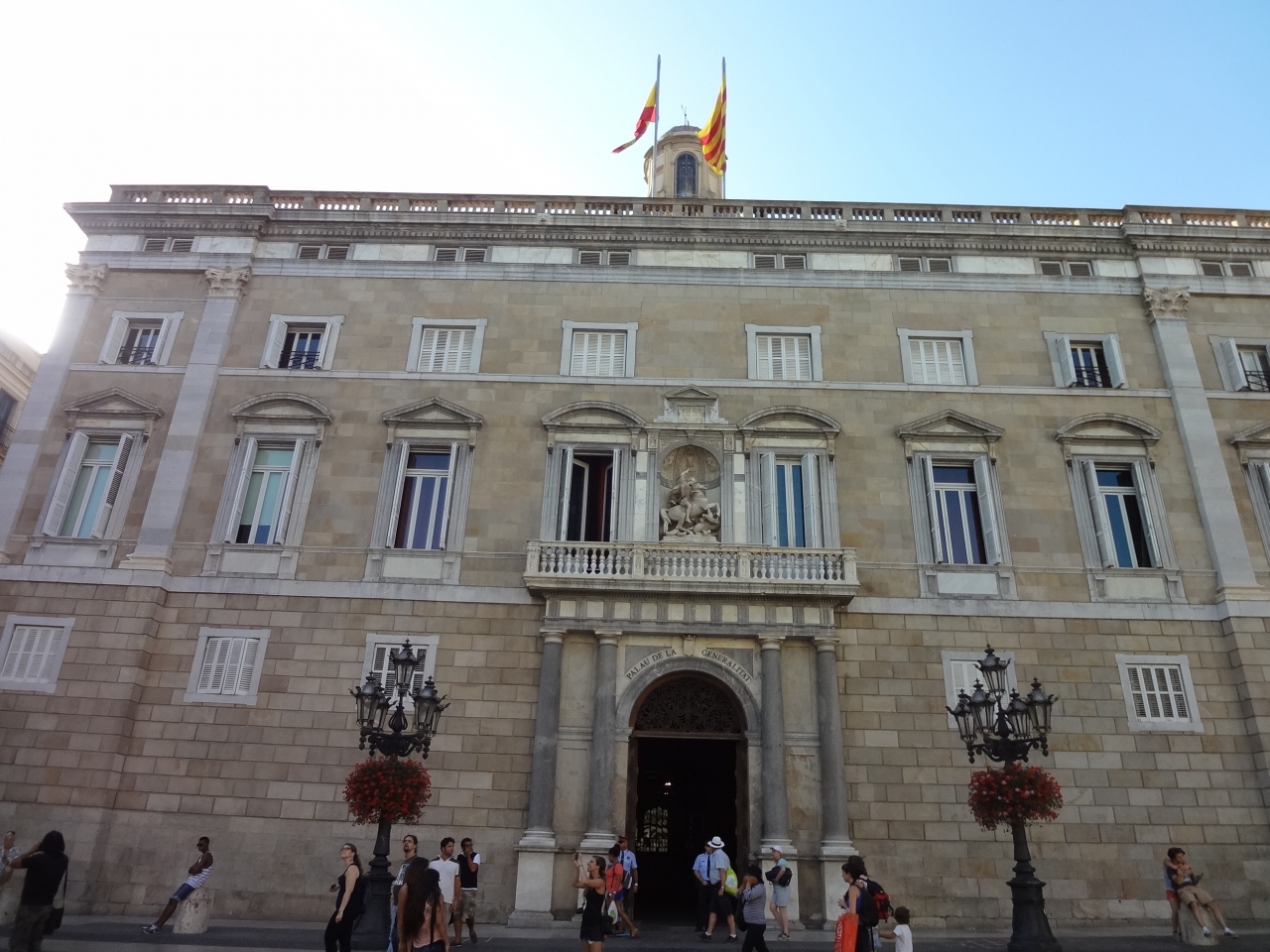 ランブラス通りからカテドラルに向かう途中、人がそれほど多くない、感じの良い広場があり、それがサン・ジャウマ広場でした。広場の両側を占めるカタルーニャ自治政府庁舎とバルセロナ市庁舎には、いずれもカタルーニャ州旗とスペイン国旗が掲げられ、写真撮影のポイントになっていました。