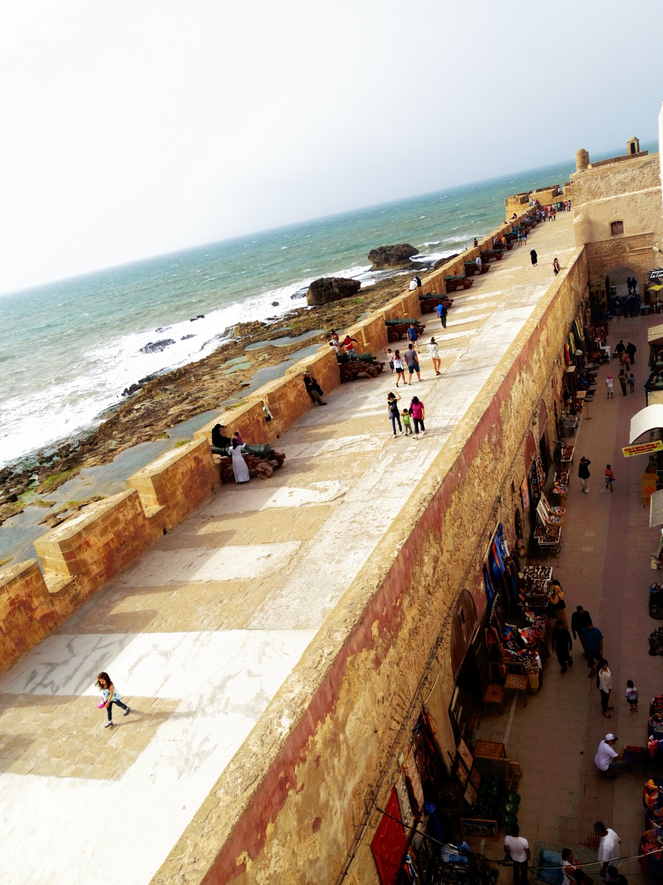 世界遺産であrエッサウィラのメディナを覆う城壁。メディナは海に面しているため城壁の上から見る大西洋の大海原は迫力がある。北の一部は城壁の上に上ることができる。近くにあるホテルスマラはきれいでおすすめ。