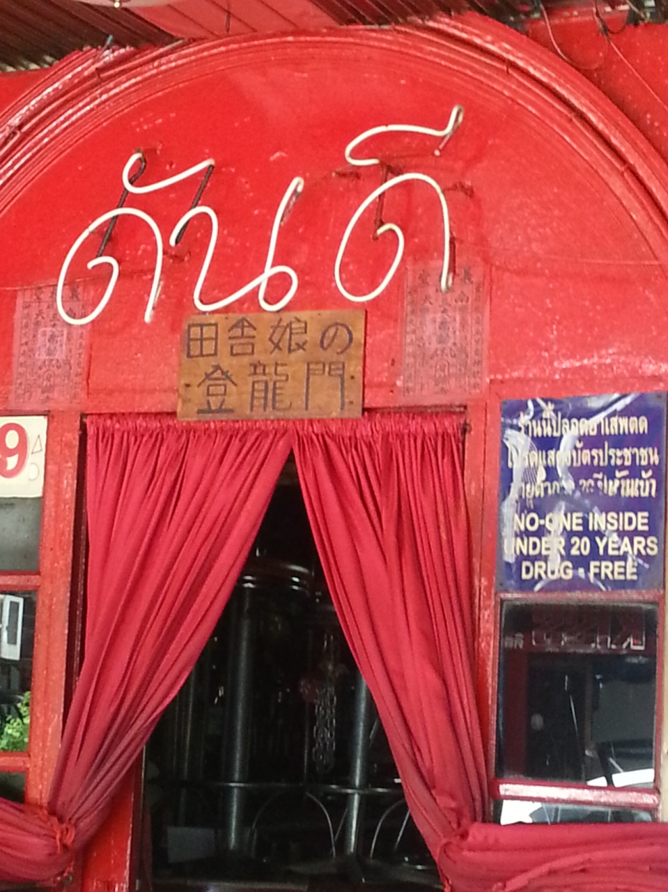 駅のすぐそばにカウボーイソイという有名な繁華街があります。ゲストハウスはその近くので、毎日その繁華街を素通りして、駅に行きます。繁華街に一軒のバーの入り口に''田舎娘の登竜門''のかんばんが貼っています。あの映画''プリティーウマン''と同じニューアンスですね。きっと日本人のお客さんが教えたはず!(*^^*)