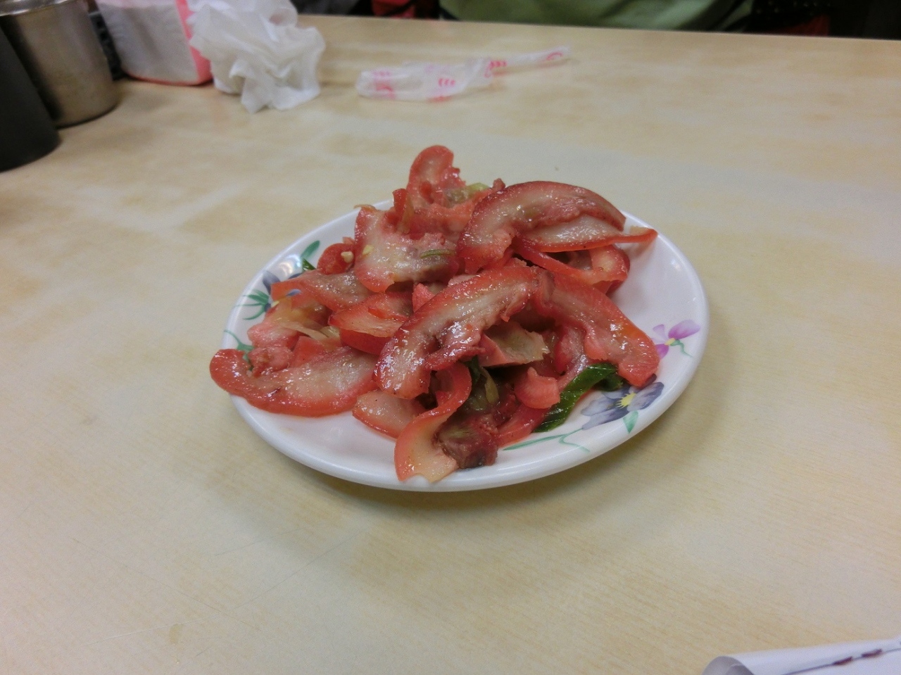 お店の入口付近にあるショーケースに色々な料理がのった小皿は 注文時に指をさすと 「自分で取ってきて」と言われるので 好きな物を取ってきます。