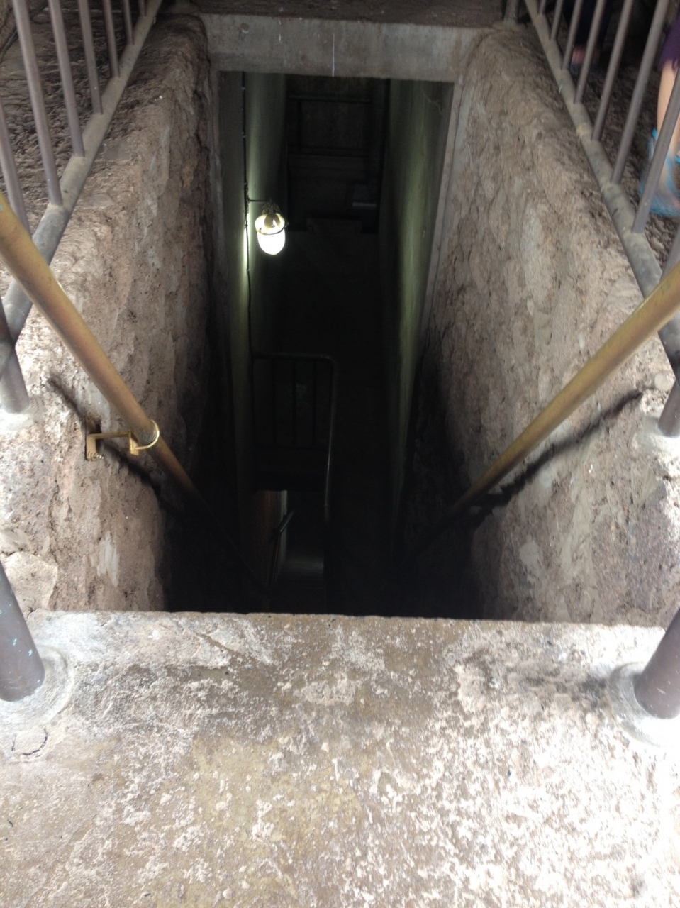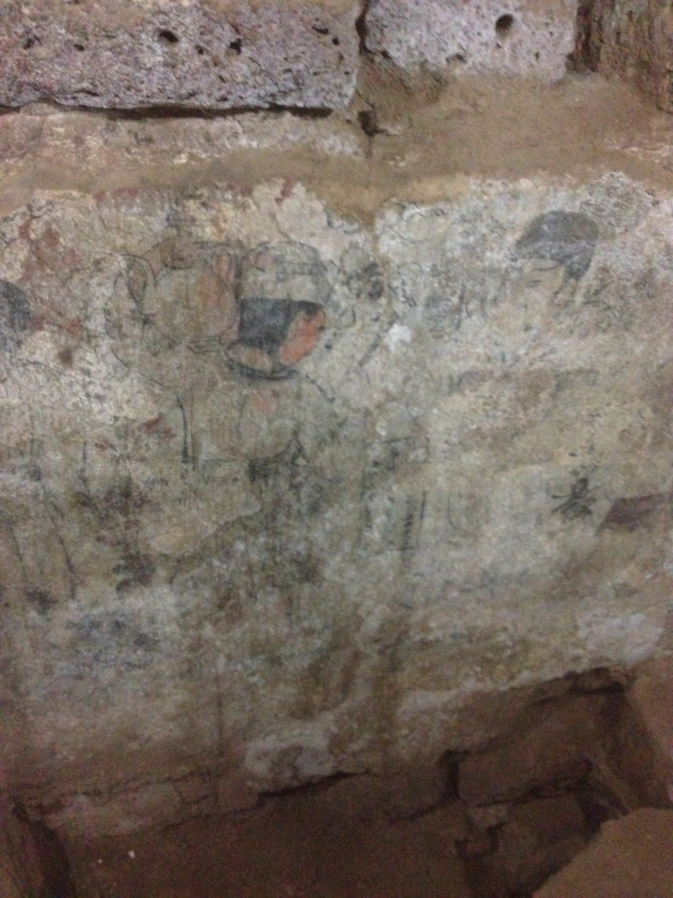 仏塔の真ん中あたりの入り口を入ってある細く急な階段をこわごわおりて行くと人が1人ぐらい入れるスペースがあり天井、壁に壁画があります。
