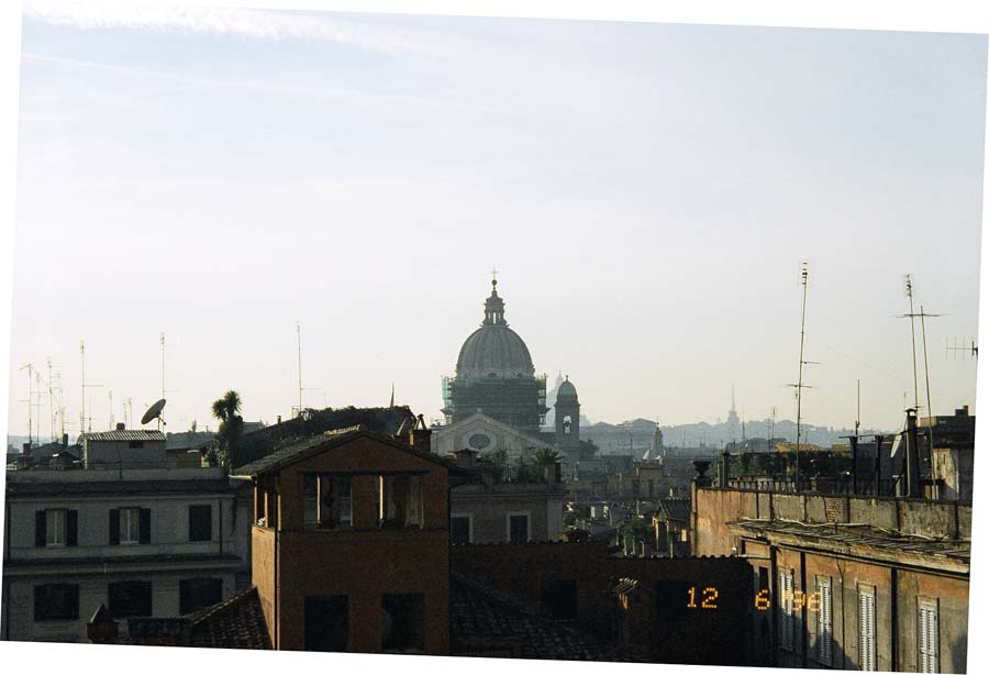 噴水のあるスペイン広場からスペイン階段を上がり、教会の前のちょっとした広場のことをいいます。ここから景色を眺めるのが良いそうで、バチカンのサンピエトロ大聖堂が見えるようです。(写真の円筒が多分それ)。夕焼けの時間がいいそうですが、その分かなり、混んでいるようです。