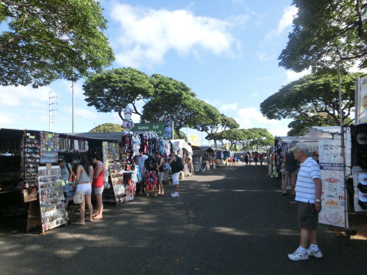 アロハスタジアムで毎週水、土、日と開催されているスワップ・ミートに水曜日に行ってきました。訪れたのがオープン直後の9時頃で、お客さんはまだ少なかったです。Tシャツや、民芸品などが多く並んでおり、私もハワイアンキルトのバックや、民芸品をお店の人と交渉して値引きしてもらって買ってきました。