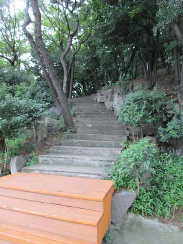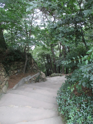 北、西、東のどこからでも登れますが、東の入口は朝鮮通信使歴史館の中に入り2階にあるドアから外に出ると右手に遊歩道が見えます。