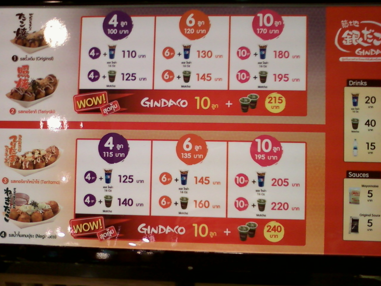 この築地 銀だこは、東京の有名なたこ焼き屋さんです。普通のソース味の他テリヤキ、てりたま、ねぎたこなどの種類があり、色々な味を楽しめます。値段は日本とあまり変わりませんのでタイでは割高だと思います。本場関西にも劣らない美味しいたこ焼きでした。