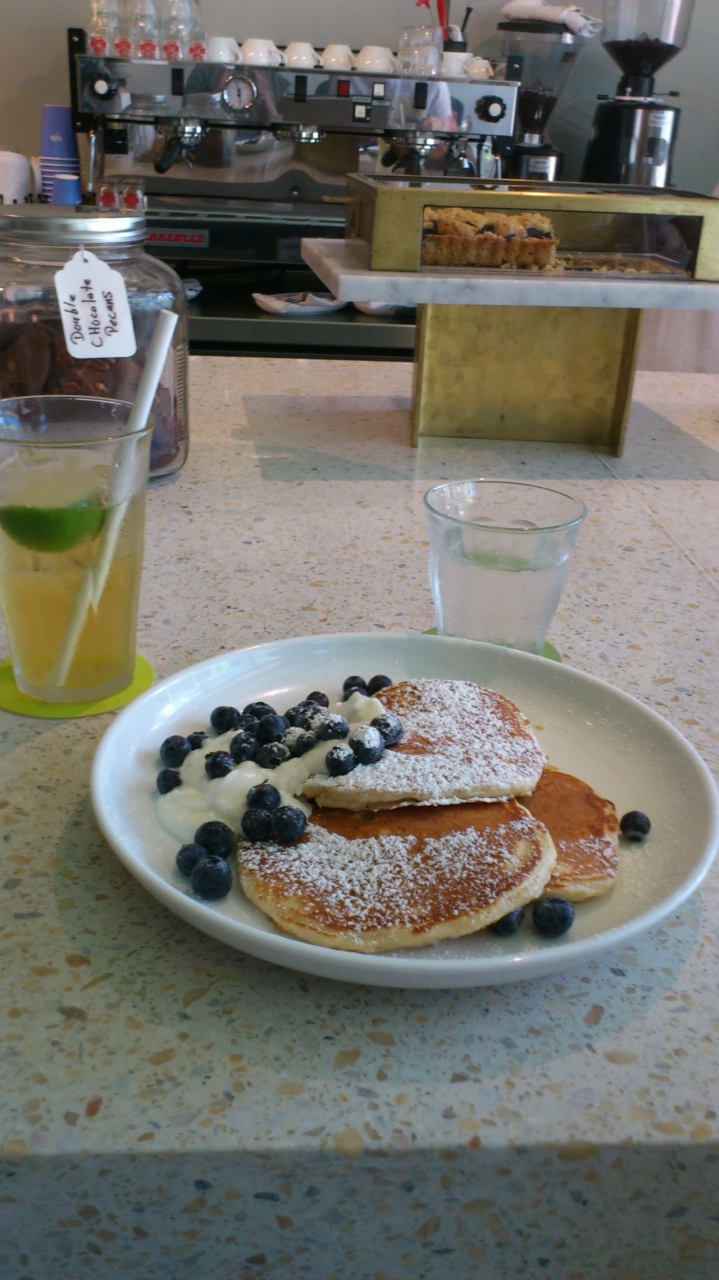 1階のカフェと2階のレストラン両方あいていましたが、私たちは1階のカフェへ。これが間違いでした~。なんと1階ではリコッタパンケーキが食べられないとのこと( ̄▽ ̄;)かわりに別のパンケーキを食べましたが、他のお店のようなしょっぱい系ではなく、甘いパンケーキでした。お店の雰囲気は、まだお店自体新しいのでとてもキレイで店員さんはオシャレ感満載でした!