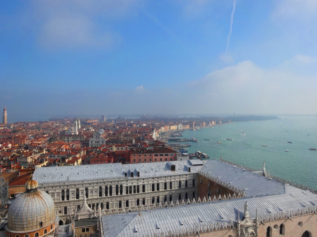 サンマルコ広場の周りのカフェは割高ですが、フローリアンなど歴史の深いお店が多いので好きな方はぜひ。大鐘楼に昇るとイタリアらしい町並み、運河に囲まれたベネチアの地形がよくわかりますのでおすすめです。