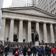 ウォール街にあり、証券取引所の斜め向かい。このあたりの観光に訪れれば必ず前を通ると思います。なのでいつも階段に人がたくさん座っていて、ワシントン像と記念撮影する人たちも後を絶ちません。