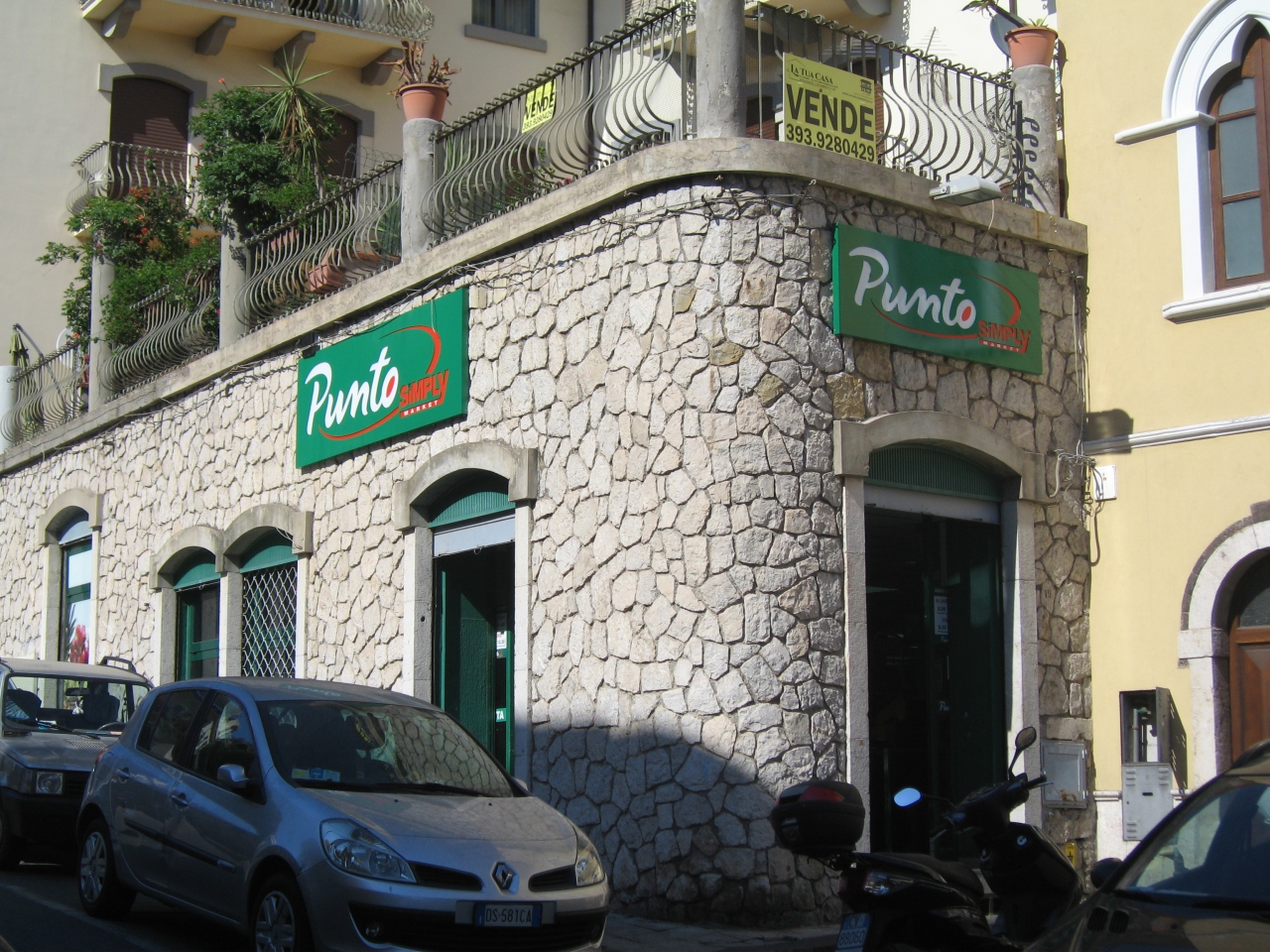 タオルミナのメイン通り『ウンベルト?世通り』は,メッシーナ門とカターニア門にはさまれた通りです。レストラン,お土産屋さんなどたくさんお店がありますが,カターニア門を出た先にスーパーがあります。カターニア門を出て,そのまま直進すると,車が通る広い道路があります。その道路を右(山側)に向かって少し歩くと『Punto』というスーパーがあります。水などは安く購入できます。