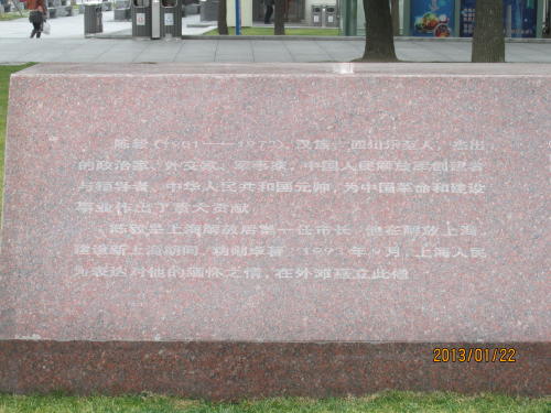 陳毅は初代の上海市長です。若い時から共産党へ入党し革命運動を続け建国時の初代の上海市長です。その後党の要職を歴任した。しがし文化大革命の時、革命時の軍幹部を粛清され地位を剥奪された。晩年名誉は回復された。