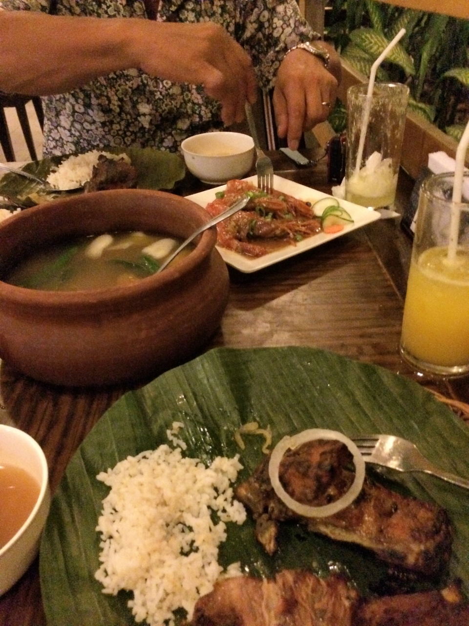 スペアリブとガーリックシュリンプ、ガーリックライス、シニガンスープとベジタブルサラダとマンゴージュースを頼みました。