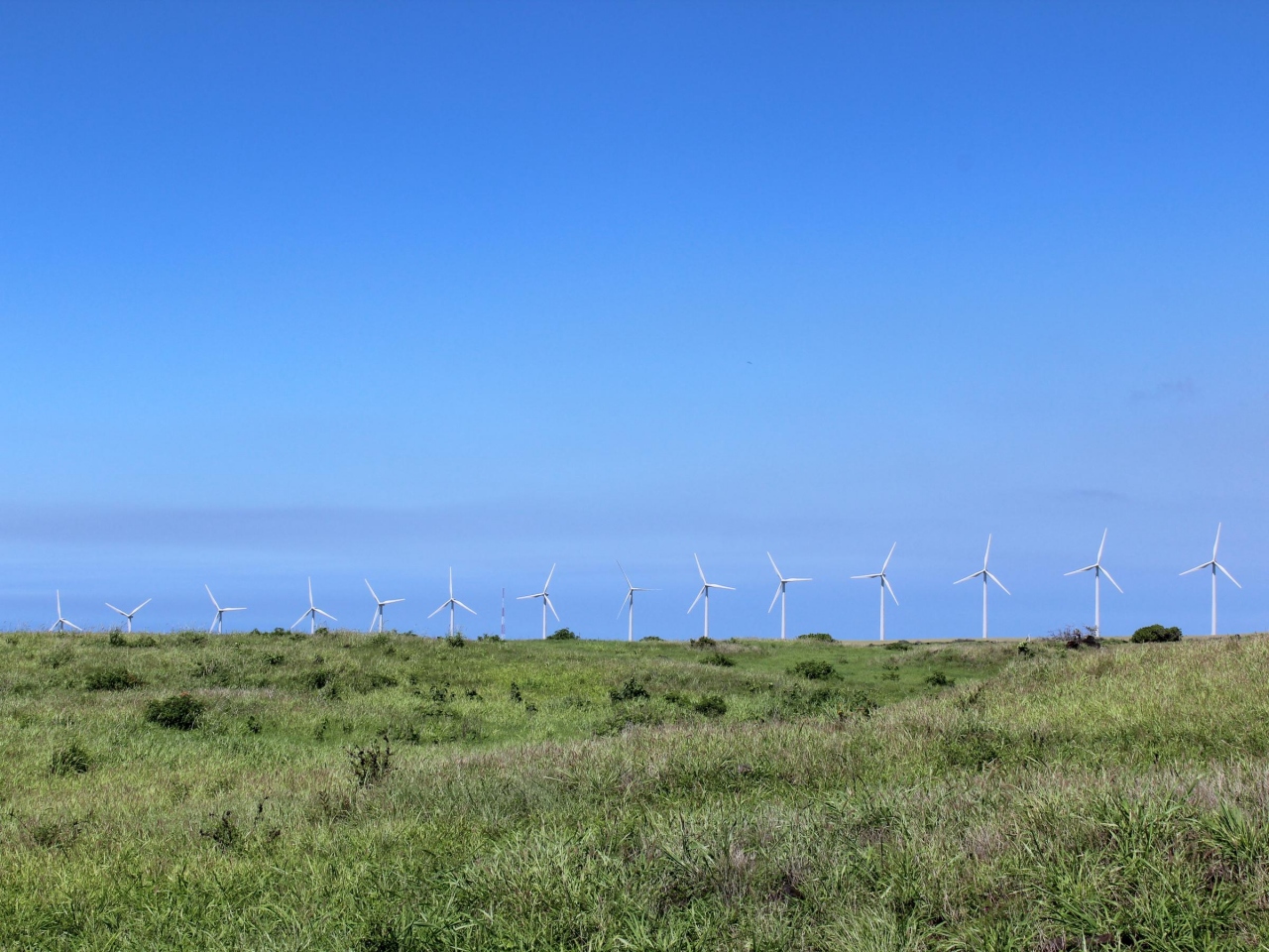 途中には、牧場が広がり風力発電の風車も見えます。