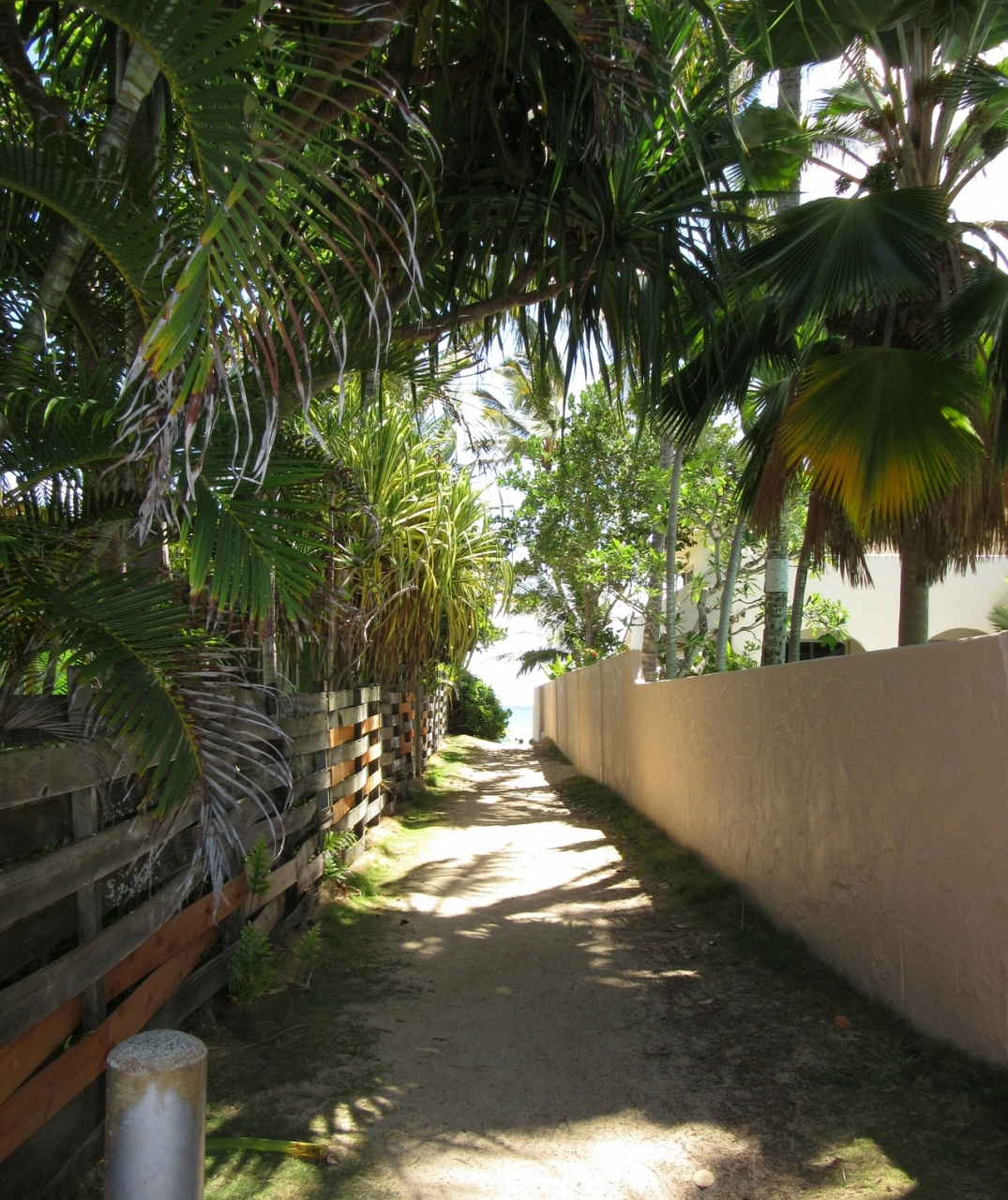 住宅街の小道をぬけると白い砂浜エメラルドグリーンの海が広がっています。