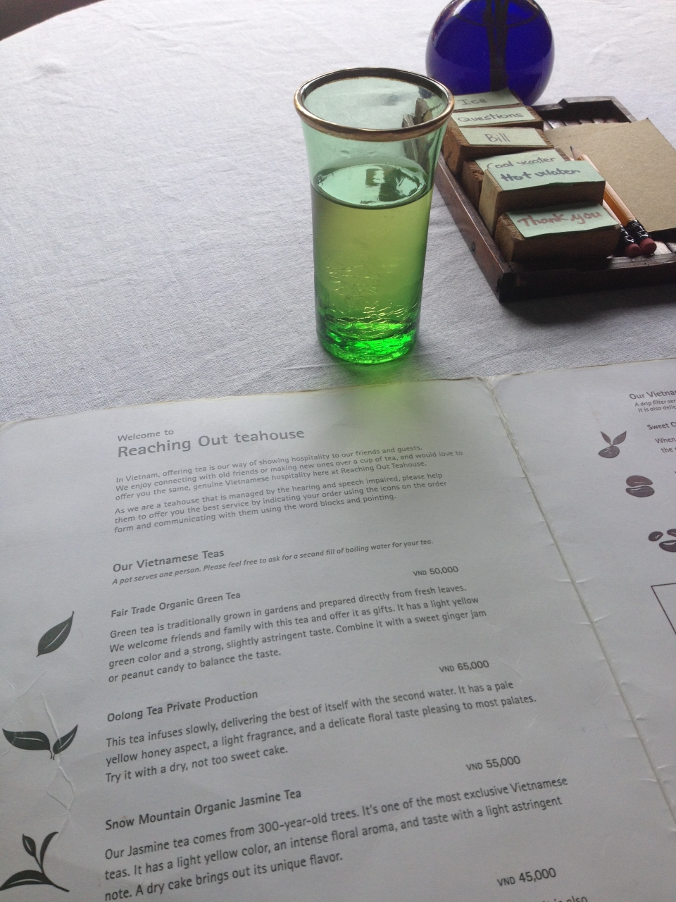 店員さんが話すことなく身振りでオーダー用紙を渡してきます。えんぴつが置いてあるので欲しいものに丸を付けて渡すシステムです。初めは戸惑いましたが、とても静かな空間で外の風景を眺めながらお茶をいただけます。お勧めはgreen tea 日本人好みの急須で入れた濃いめの緑茶です。海外のgreen tea は砂糖が入っていることもありあまり良い印象がなかっただけにここのお茶は格別です。ベトナムの物価からすると高め(とはいえ300円程度)ですが、訪れる価値はあります。