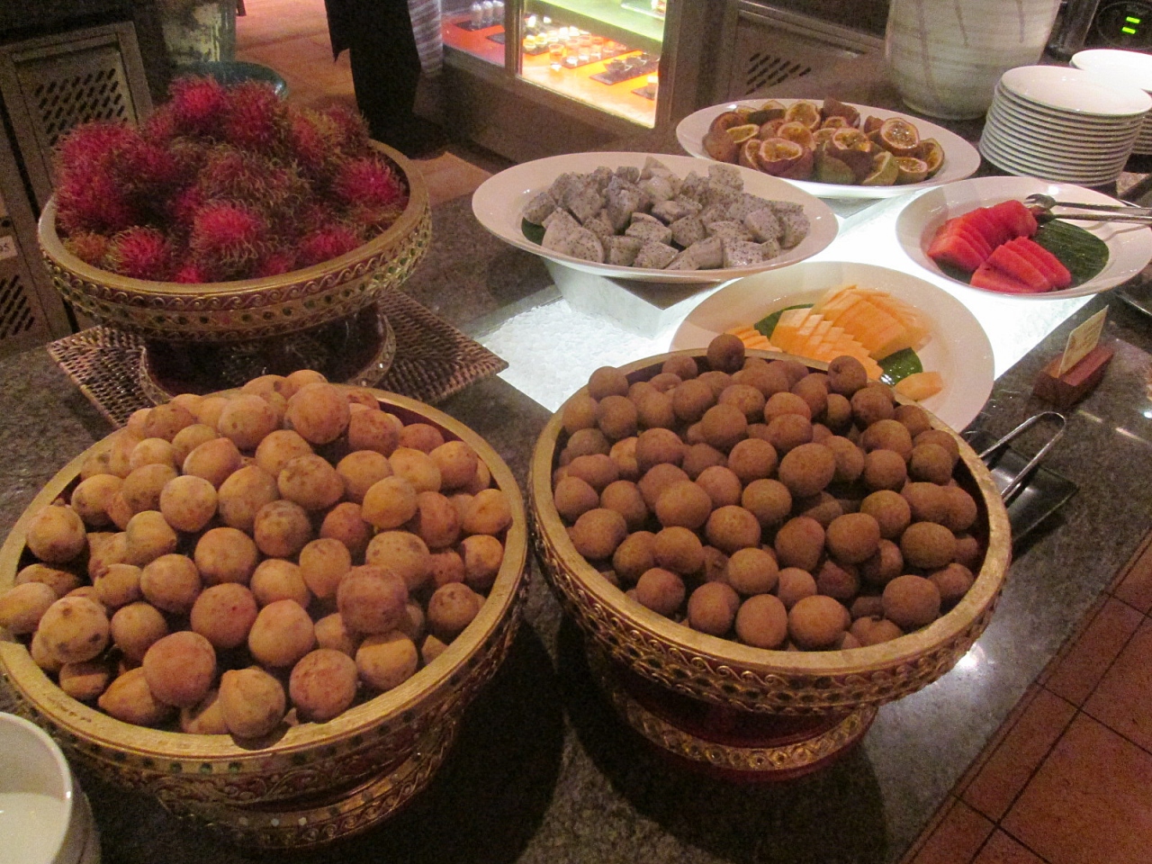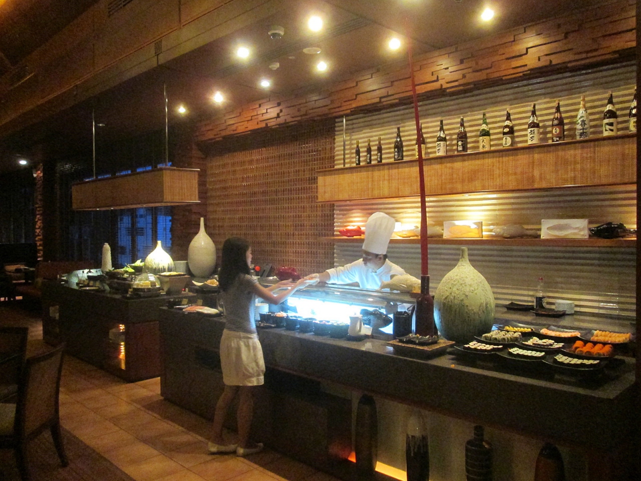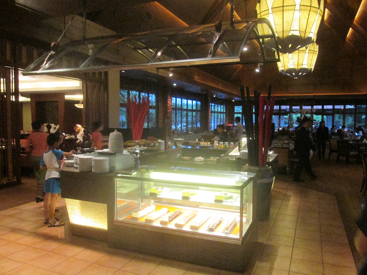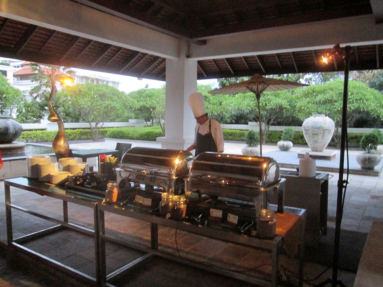 久しぶりに「ガートカフェ」に行くと、バーベキュー・ディナービュッフェが開催されていました。料金は688THB(税・サービス料込)ですから、日本円だと2千数百円程になります。天井が高い北タイ風デザインの店内には高級感がありますが、屋外にもテーブル席が設けてあり、「シャングリラホテル・チェンマイ」の広い庭の雰囲気の中で食事を楽しむこともできます。店内にはパン・スープ、ご飯類という2台ビュッフェ台以外に、サラダ・寿司・刺身、スイーツ、パスタ・麺類、ピザ、メイン料理という5台のビュッフェ台はオープンキッチンも兼ねていますので、ピザ・パスタは好みに応じて作ってもらえますし、アイスやスイーツも取り分けてもらえますが、アイスの容器が冷やしてあるなど「さすがシャングリラ!」というサービスです。もちろんバーベキュー台は屋外に設けられ、肉やバンダンの葉に包まれた魚などが焼かれていました。料理・サービスの質は極めて高く、これで688THBであれば、何の文句もありません。