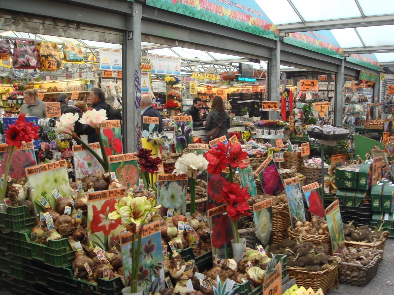 ガイドブックの写真ページでシンゲルの花市のことを知り、ぜひ行ってみたくなりました。アムステルダムではアムステルダムカードを使っていたため、トラムも乗り放題。シンゲル運河の近くまでトラムで行き、運河沿いに歩くとすぐ見つけることができました。数々の球根に珍しい花々、おもしろいサボテンなど見ると欲しくなりますが、検疫されていないので日本には持ち込めません。