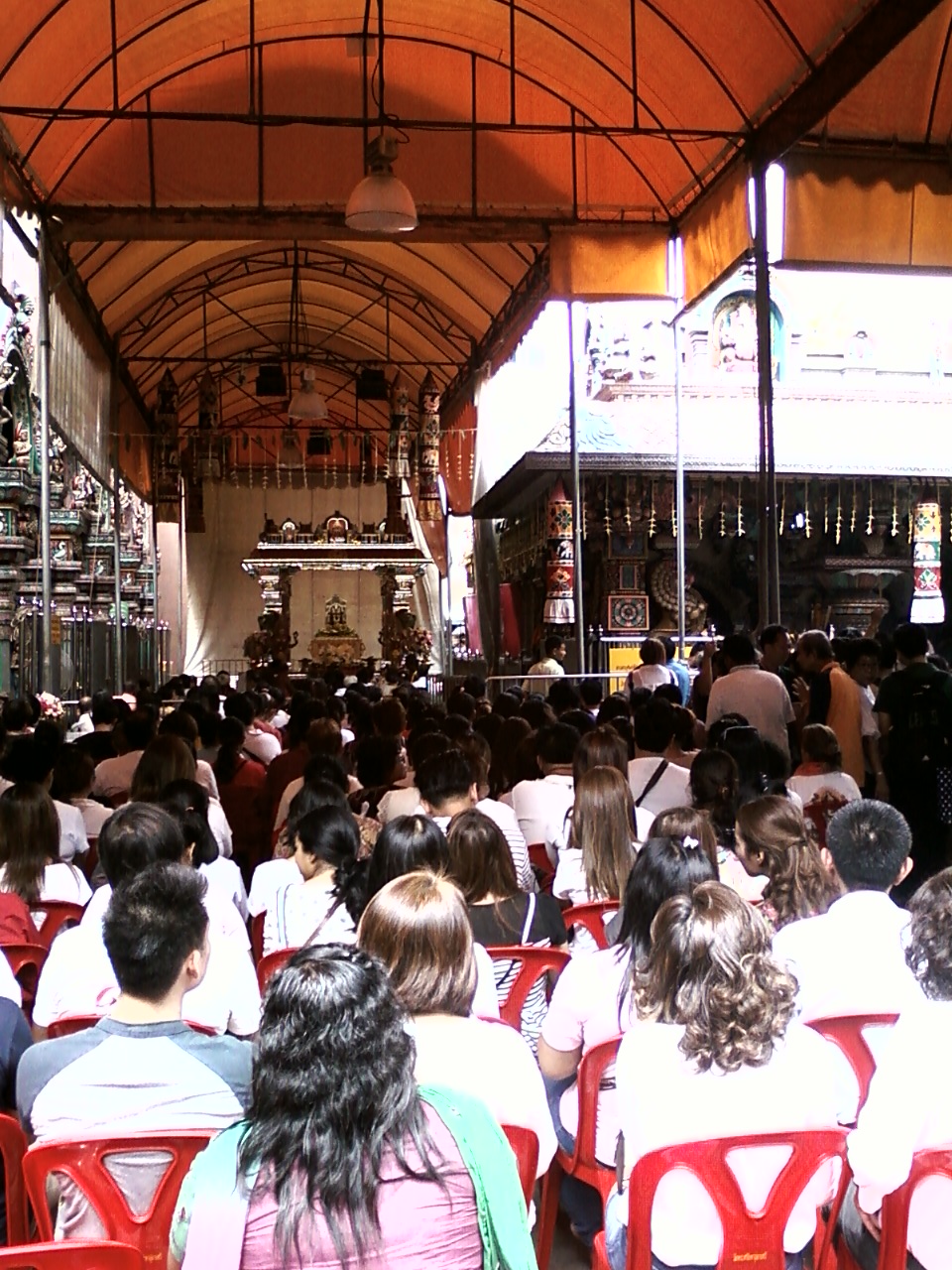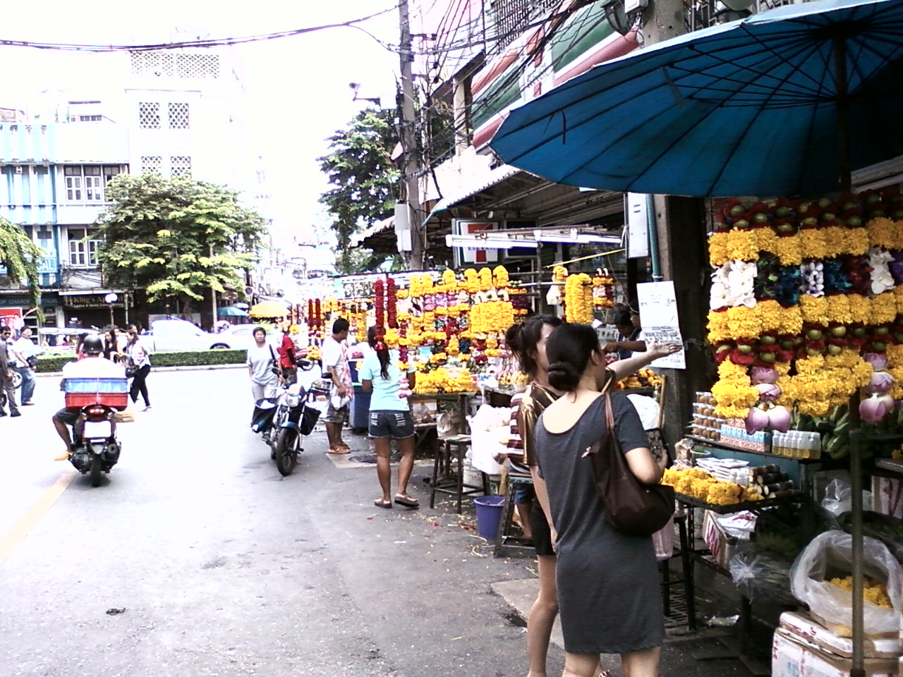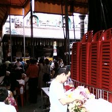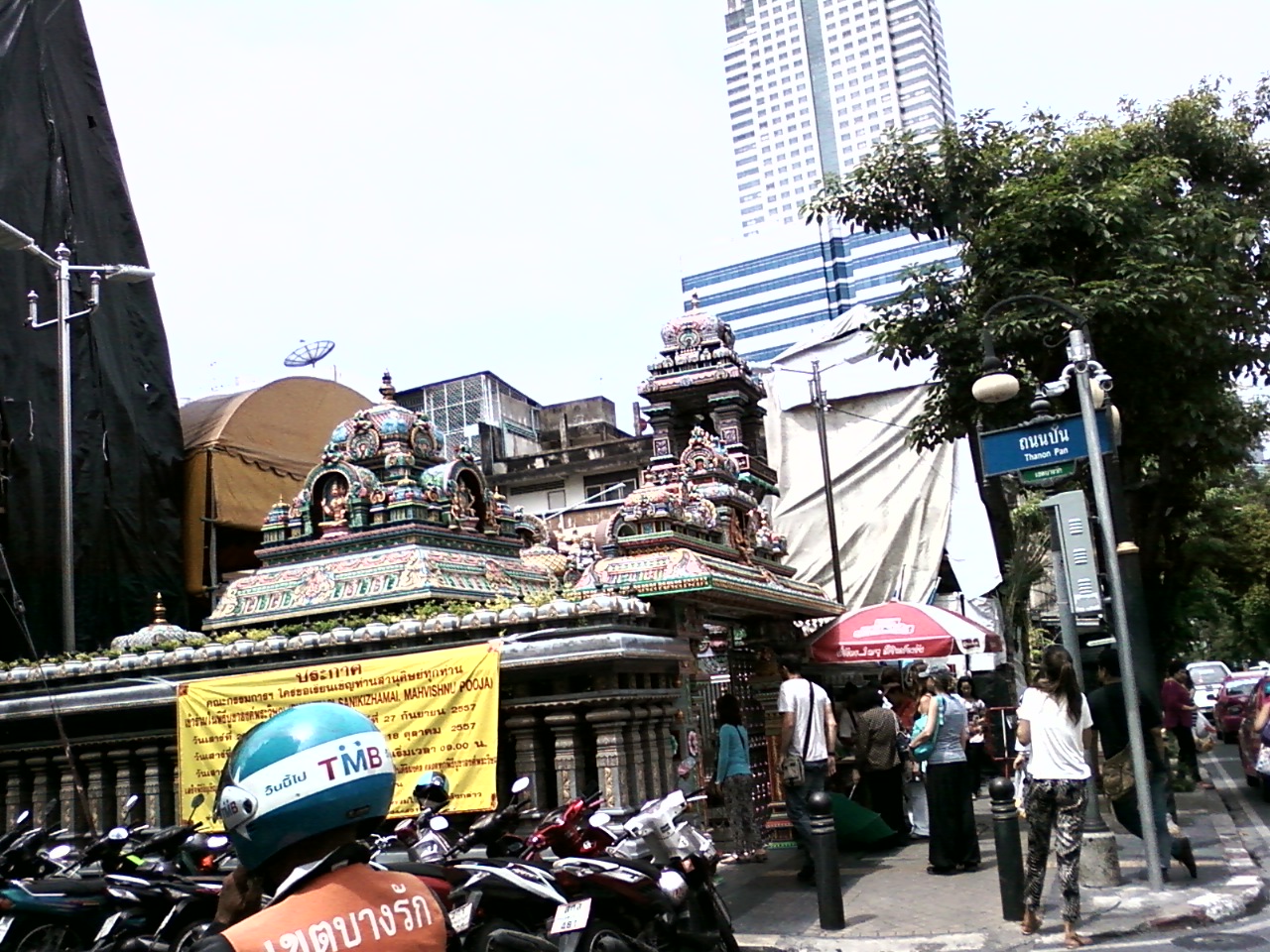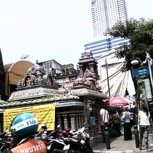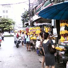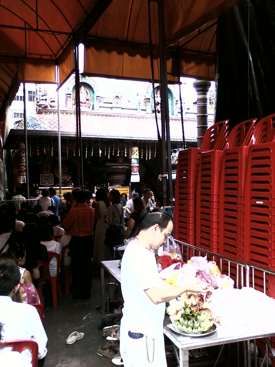 このワット・シー・マハー・ウマーテウィーは、シーロム地区にあるタイでは珍しいヒンドゥー教の寺院です。この日は平日にもかかわらず、多くの参拝者が訪れていました。周りにはお花や線香、お供えを売るお店が多くありました。またヒンドゥー教の寺院らしく、ガネーシャ像などを売る屋台も何軒かありました。