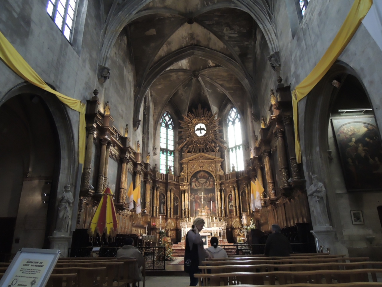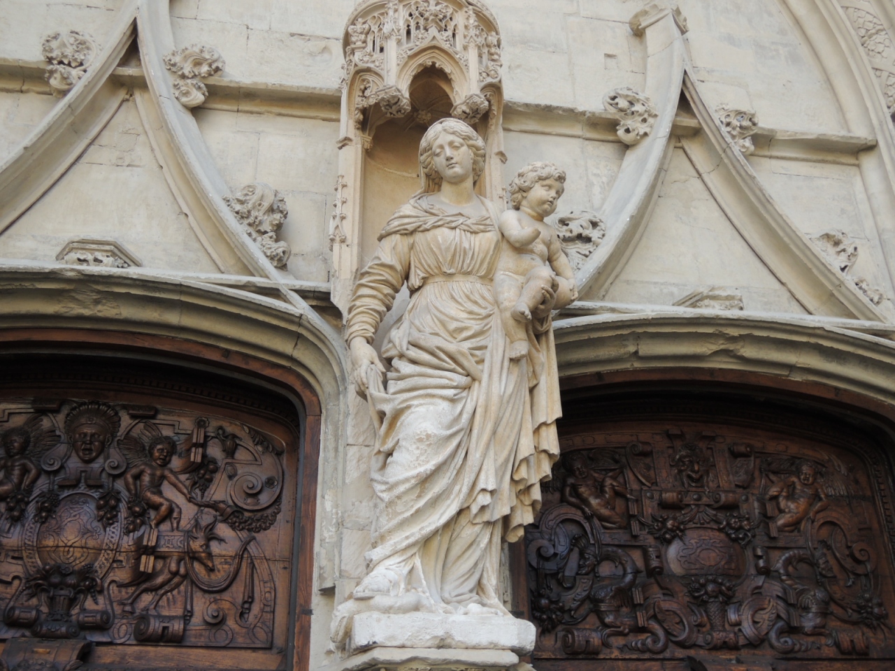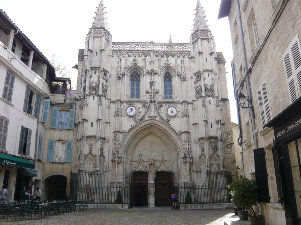 H社の格安ツアーでアヴィニョンに行きました。一時間のフリータイムの間にサン・ピエール教会に行きました。正面が人面に見える教会です。教会入り口の木の扉、入り口上面の聖母子像など素晴らしい彫り物です。木の扉は黒光りしていて年期を感じます。内部に1458年に織られたこの教会のタピスリーがありました、歴史を感じさせてくれる教会です。