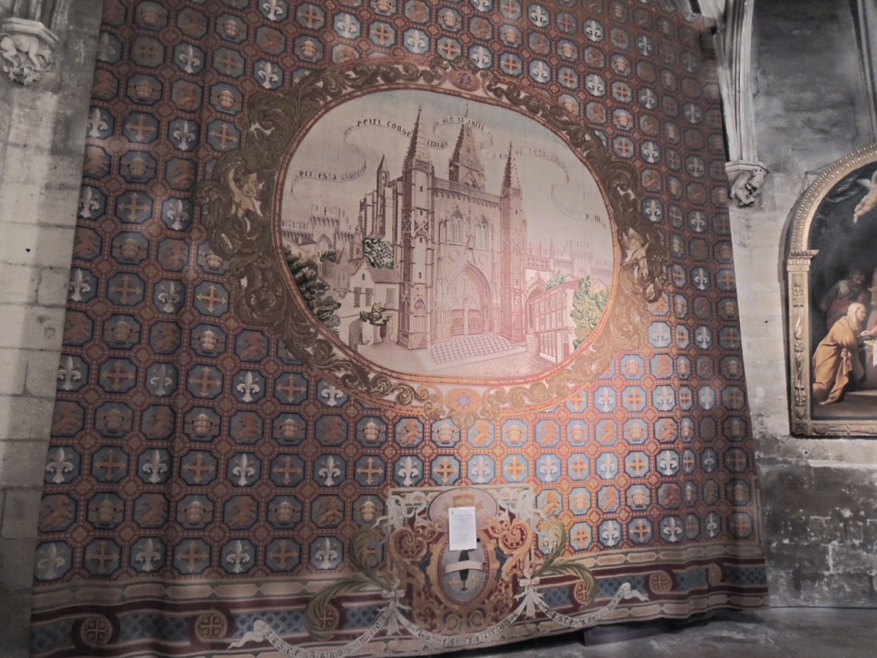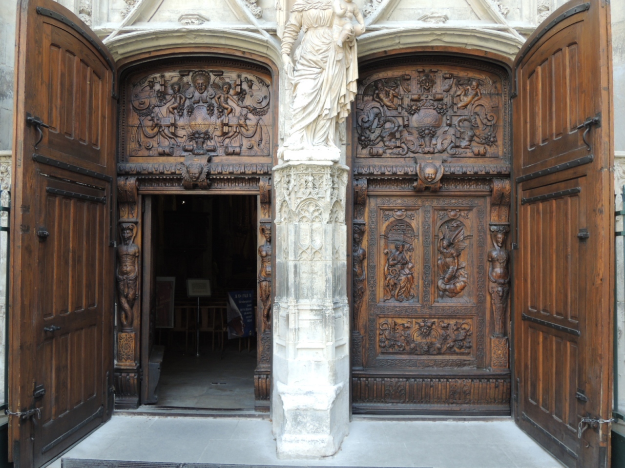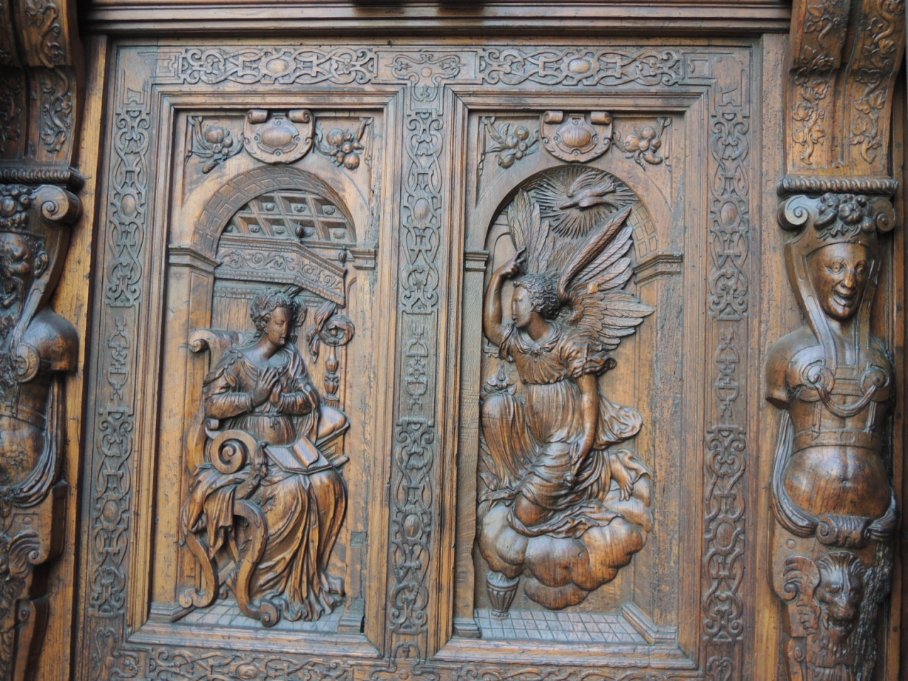 H社の格安ツアーでアヴィニョンに行きました。一時間のフリータイムの間にサン・ピエール教会に行きました。正面が人面に見える教会です。教会入り口の木の扉、入り口上面の聖母子像など素晴らしい彫り物です。木の扉は黒光りしていて年期を感じます。内部に1458年に織られたこの教会のタピスリーがありました、歴史を感じさせてくれる教会です。
